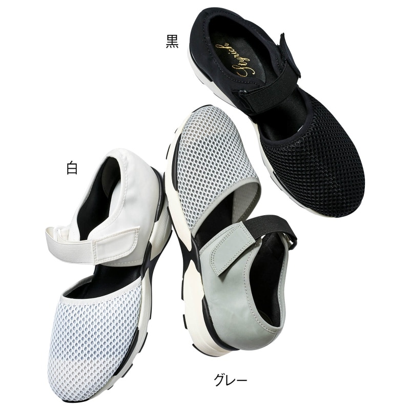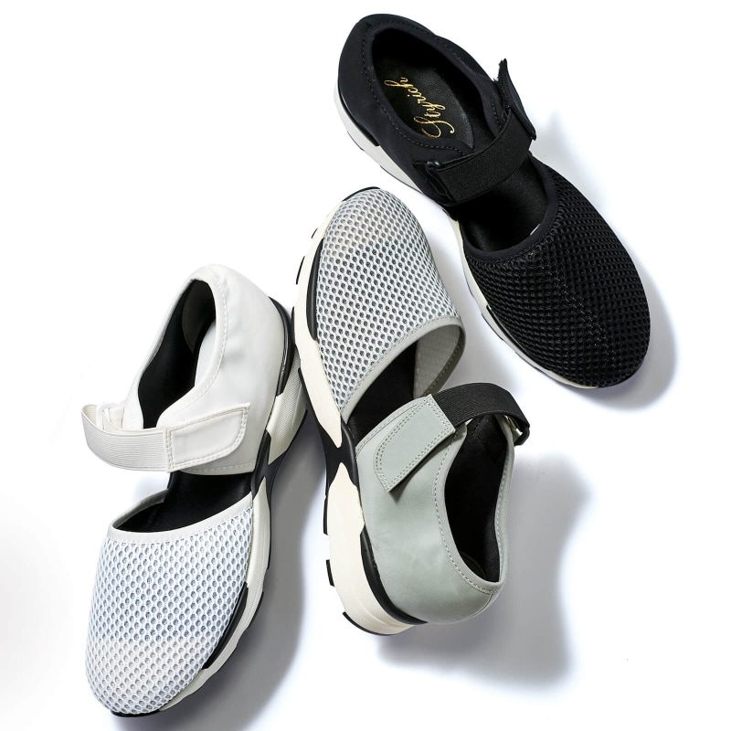 様々なコーデを今っぽく更新するメッシュ素材のベルト付。足の甲が少しだけ見えるデザインで抜け感を演出。脱ぎはきも楽々!