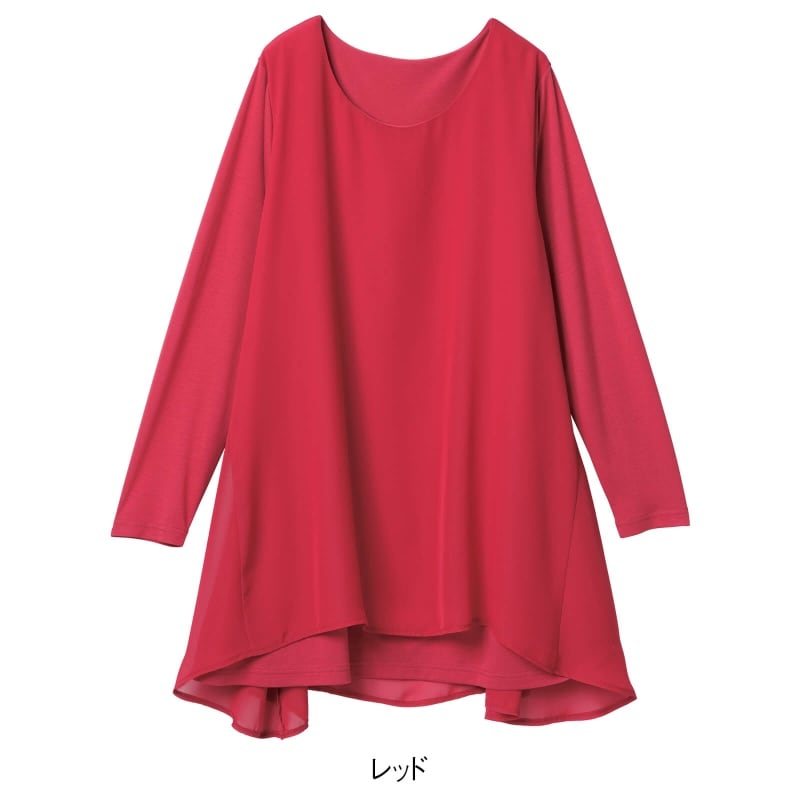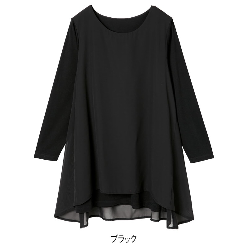 カットソーとシフォンがドッキング。見た目きれいで着心地は楽という理想的な一枚に。