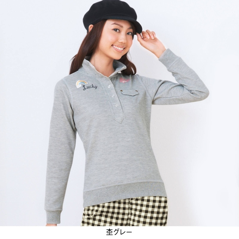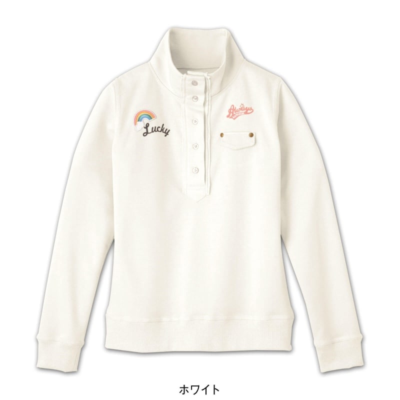 ハイネック長袖トレーナーの肩と胸にアメリカン調のロゴマークやレインボーのキュートなワッペンがポイント。