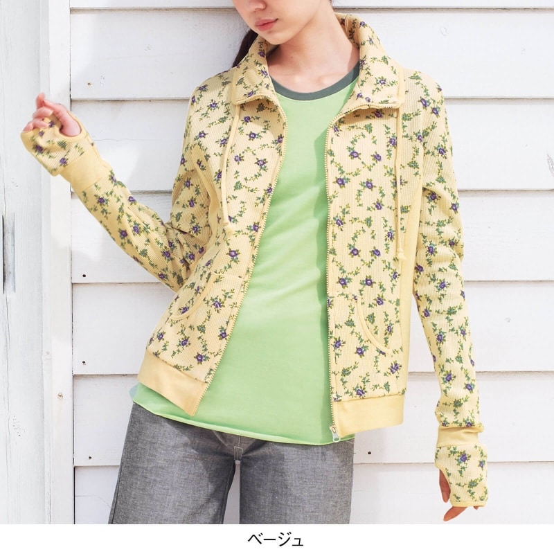 手の甲のうっかり日焼け対策に人気のゆびホール付き。しかも、エレガントな小花柄プリントを施した素材は綿100%で肌に密着しにくく爽やかに着られるワッフル素材。これはもう、見逃せませんよね。