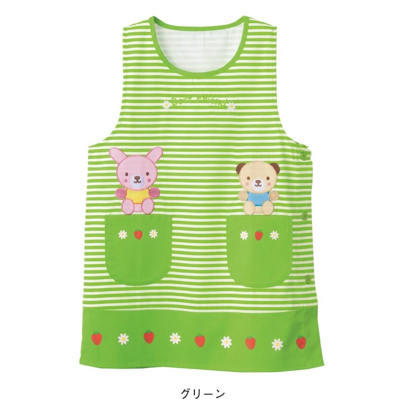 配色使いのポケットや裾には、いちごと花のプリントを添えて。