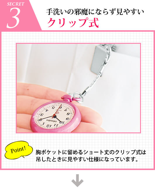 胸ポケットに留めるショート丈のクリップ式は吊るしたときに見やすい仕様になっています。