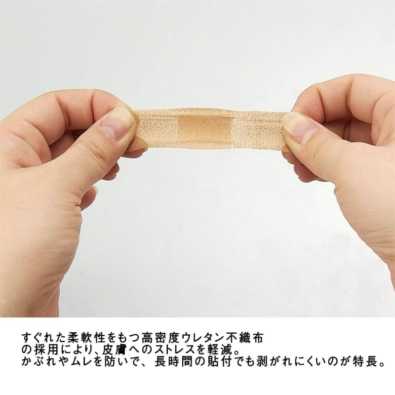 すぐれた柔軟性をもつ高密度ウレタン不織布の採用により、皮膚へのストレスを軽減。かぶれやムレを防いで、 長時間の貼付でも剥がれにくいのが特長。