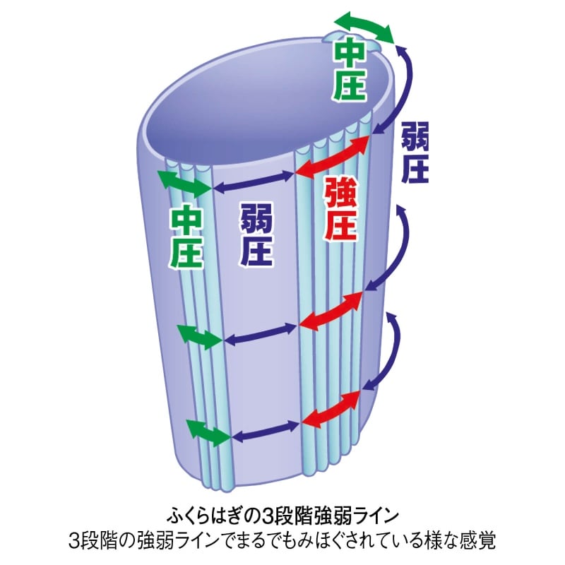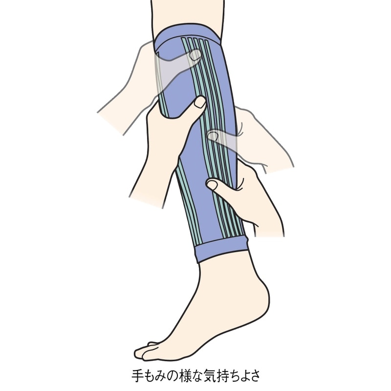 下から上への段階的な着圧と、ふくらはぎの3段階強弱ラインが、手揉みマッサージのような気持ちよさで、お疲れ脚を癒す。手もみの様な気持ちよさ!