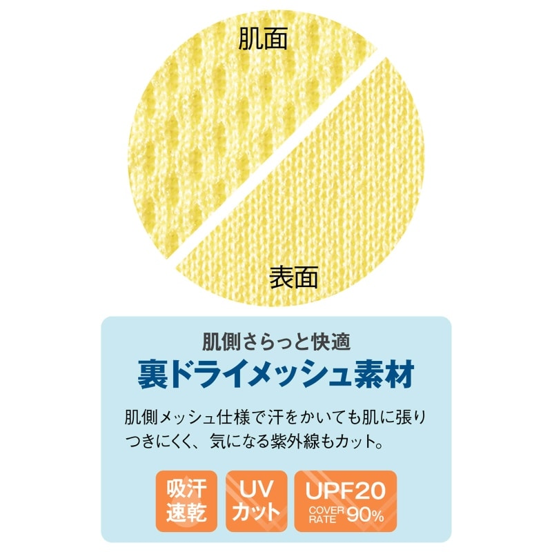 肌側メッシュ仕様で汗をかいても肌に張りつきにくく、気になる紫外線もカット。