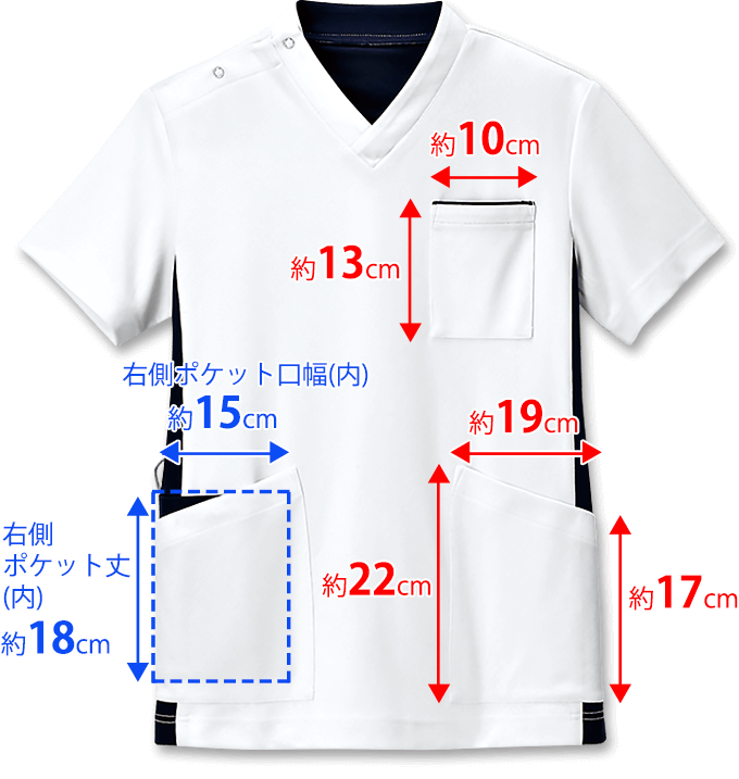 - ●ポケット位置/左胸ポケット、両脇ポケット(右脇ダブルポケット)