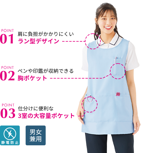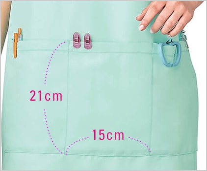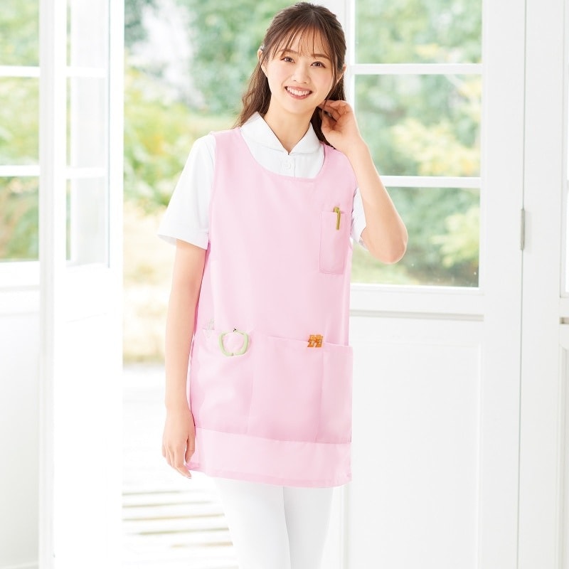 サイズが選べて、後ろの2ヶ所で止められるものを探してました。仕事していて肩がずれないので作業に集中できて助かります。ポケットは、大きめなので私としては色々道具も入り便利です。今回はミントとピンクを買ったのですが、ミントが意外と爽やかさを演出してくれて職場で好評です。これからもよろしくお願いします。投稿者:aki性別/属性:女性年代:身長(cm):体重(kg):購入したサイズ:ミント/L~LL -
