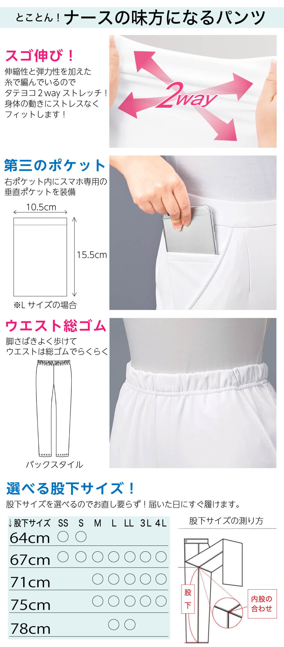 看護師の多忙な動きに対応しており、生地が柔らかくて動きやすい!、その割に生地もしっかりしてて、ポケットもついており、最高です。職場の皆んなにも薦めて買い始めています。投稿者:きゃん性別/属性:女性年代:40代身長(cm):151~155体重(kg):56~60購入したサイズ:L/股下71/ホワイト -