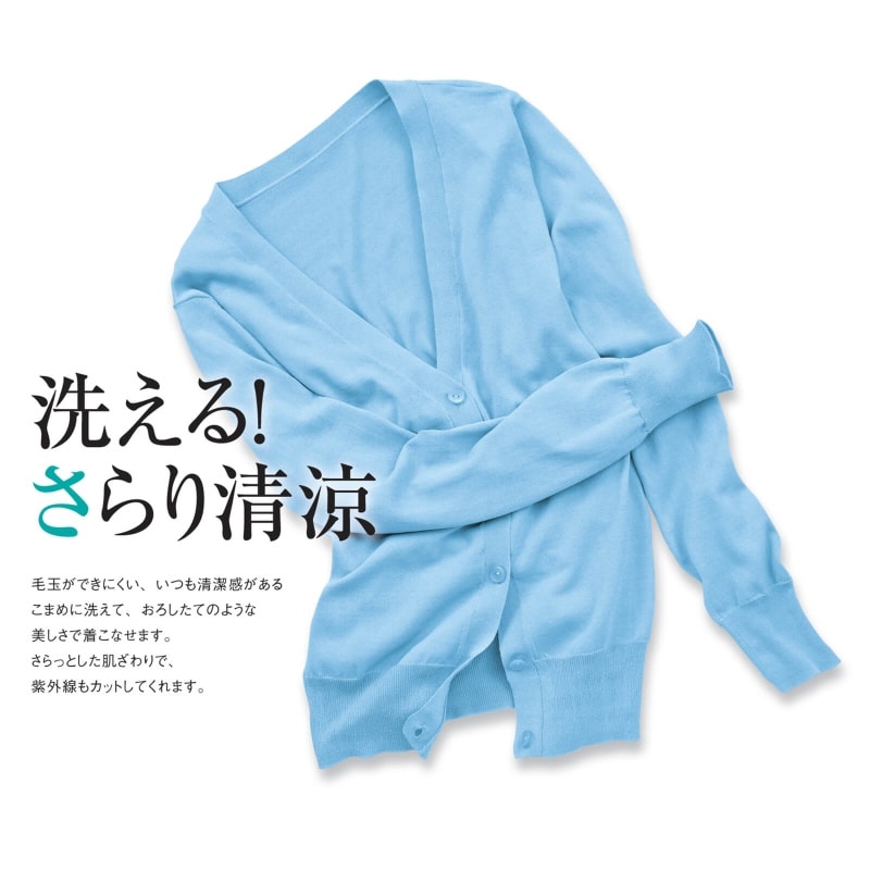さらりとした肌ざわりで気になる紫外線もカット。ザブザブ洗えて毛玉ができにくく、おろしたてのような美しさで着こなせます。