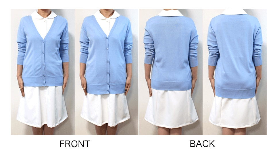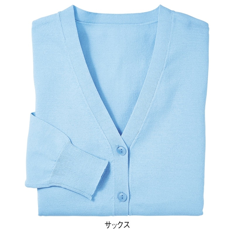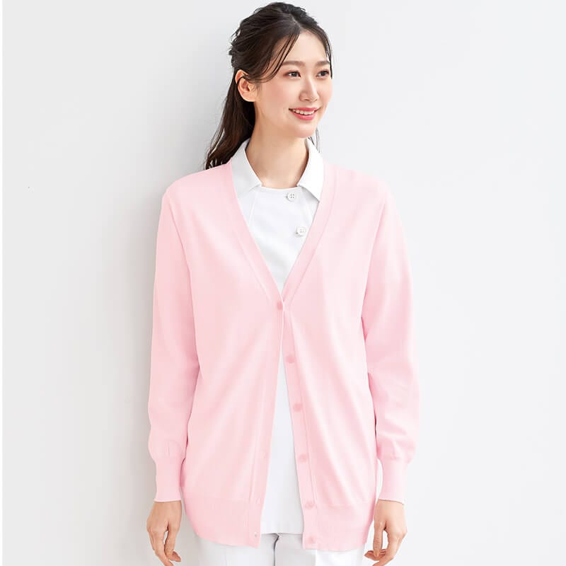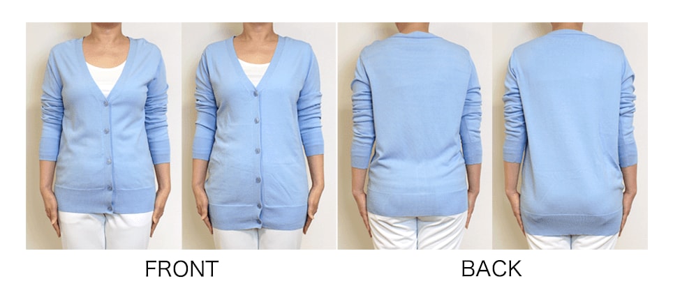 ナースカーディガンは「ナース服の上に着る」事を想定しています。一般的なカーディガンより少しゆったりめ、ナース服のジャケット襟を出しやすいようにVネックは深め、また「袖をまくる事が多い」事を想定して、袖がずれにくいようにするためリブ幅が広めでフィットしやすいデザインです。オフィス用にもオススメです。