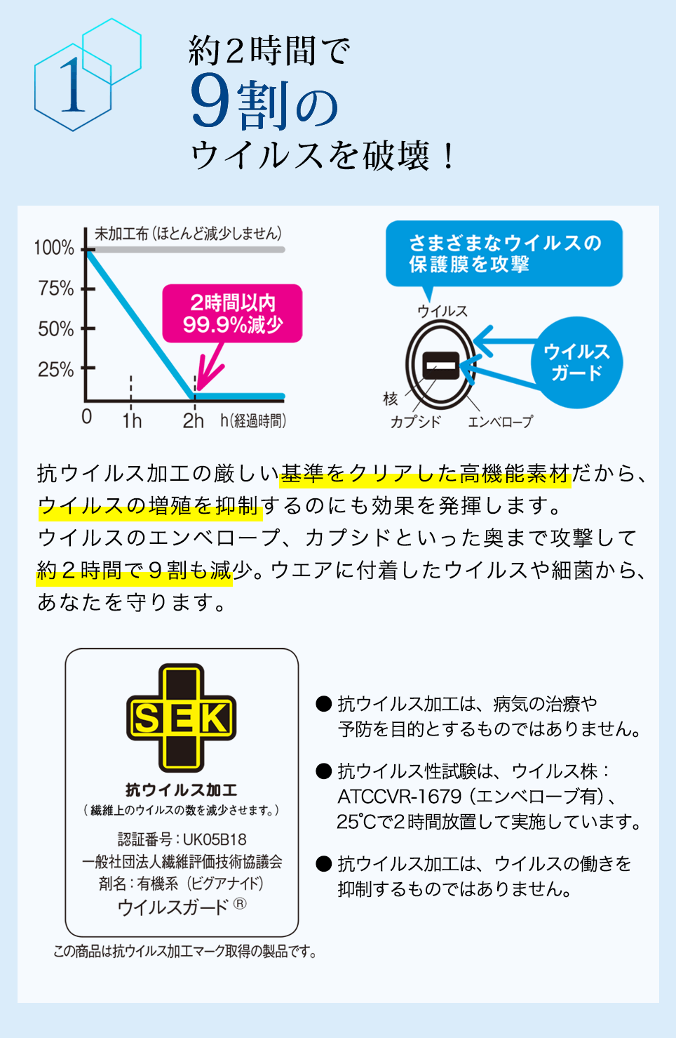 ウイルスのエンベロープ、カプシドといった奥まで攻撃して約2時間で9割以上を減少。ウエアに付着したウイルスや細菌からあなたを守ります。