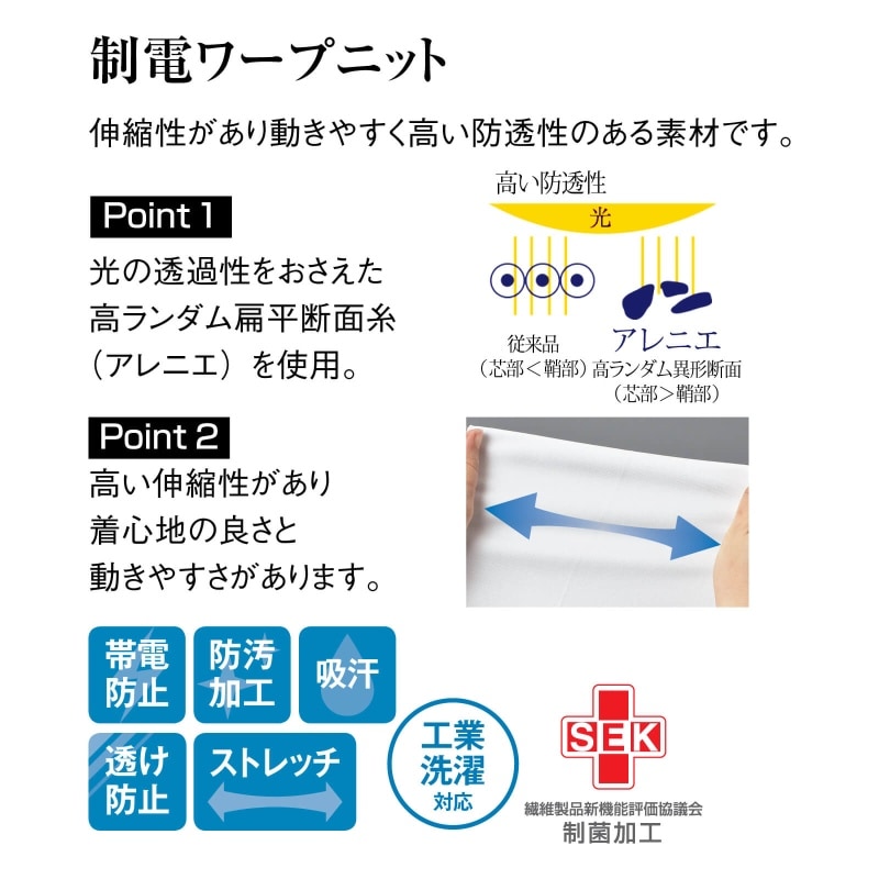 - ●素材/ポリエステル90%、綿10%(制電ワープニット)
