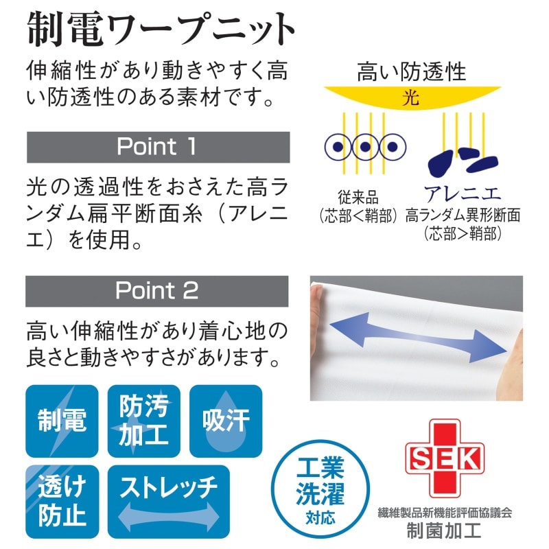 - ●素材/ポリエステル90%、綿10%(制電ワープニット)