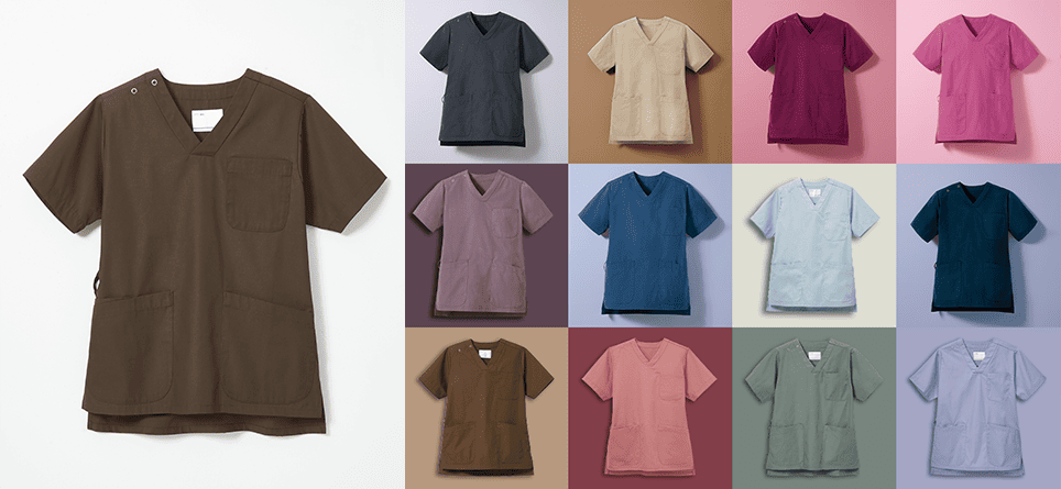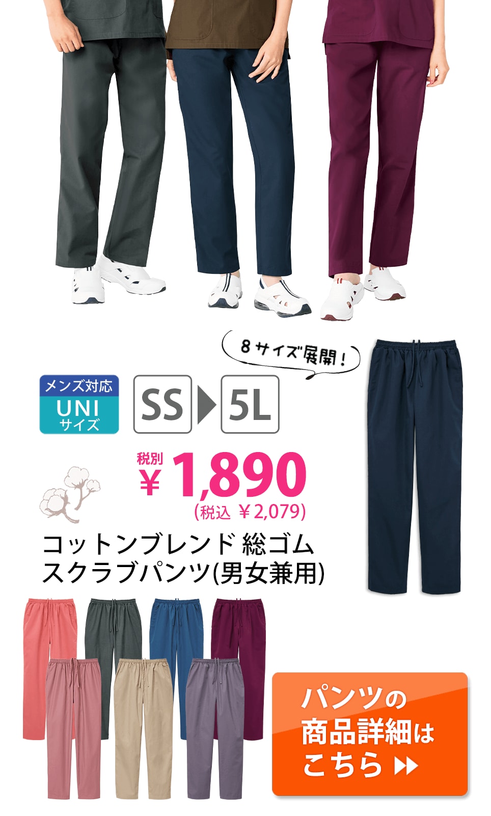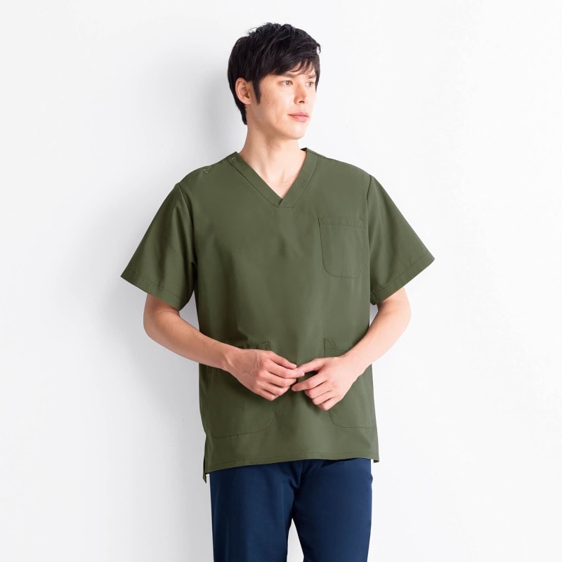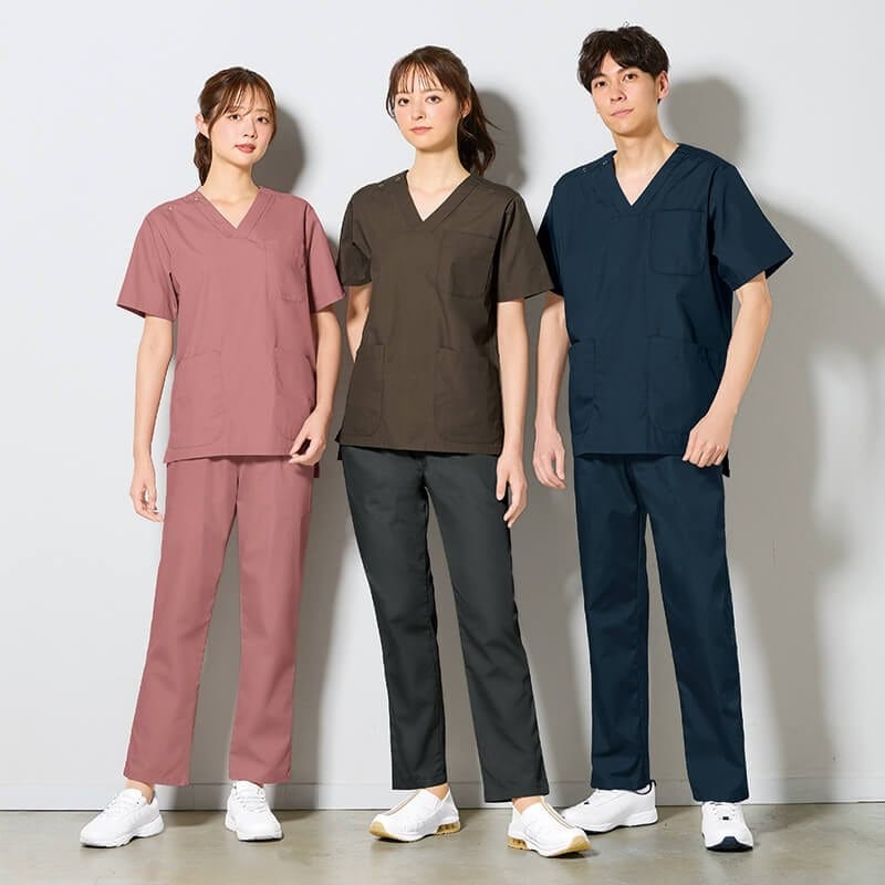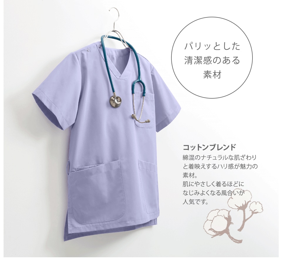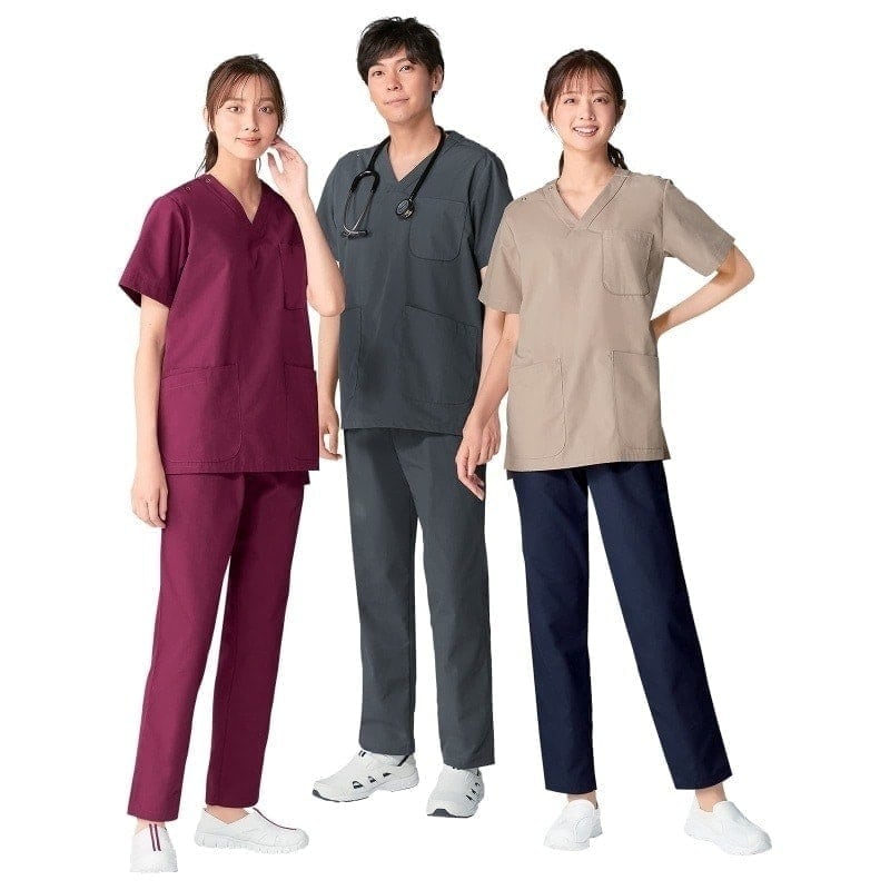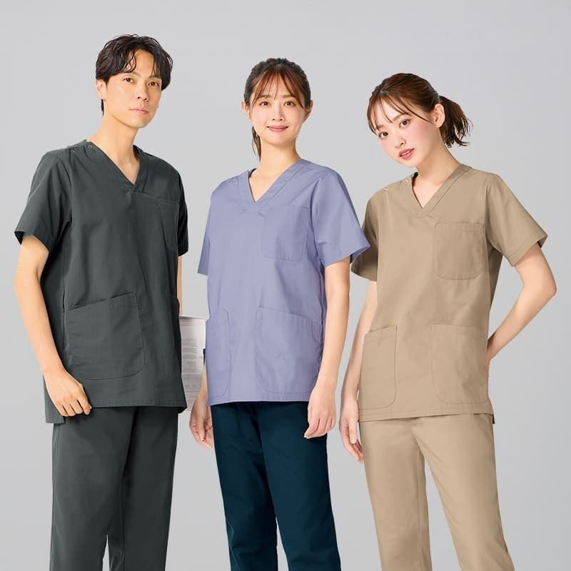 パウダーストレッチ・脇配色スクラブではショッキングピンク・オリーブ・プラムを着用してますが、コットンブレンドスクラブでも同じような感じの色で…とグレイッシュパープル・モーヴ・モスグレイ。思ったよりねずみ色ですが、落ち着いた色で気に入りました。