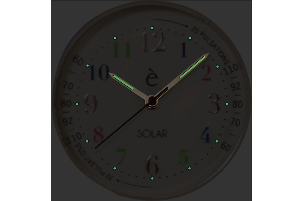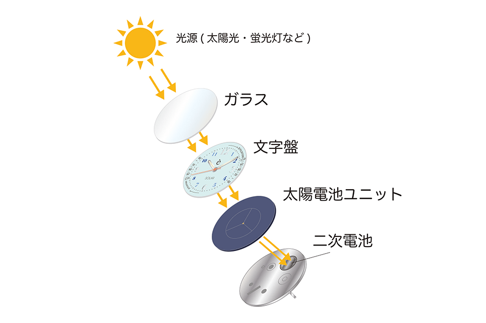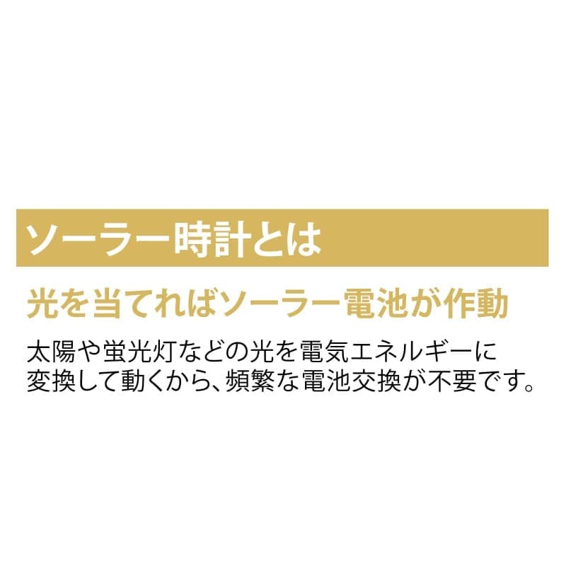 ソーラー時計とは、太陽や蛍光灯などからの光を太陽電池により、電気エネルギーに変換して動く仕組みの時計を言います。