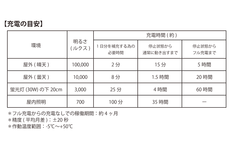 文字盤に直接日光や蛍光灯の光を当て、フル充電を行ってからご使用下さい。