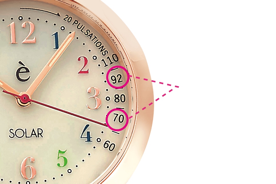 針が12時もしくは6時の時に脈を測り始め、脈が20回になった所の脈拍メモリの数字を見れば、それが1分間の脈拍数になります。