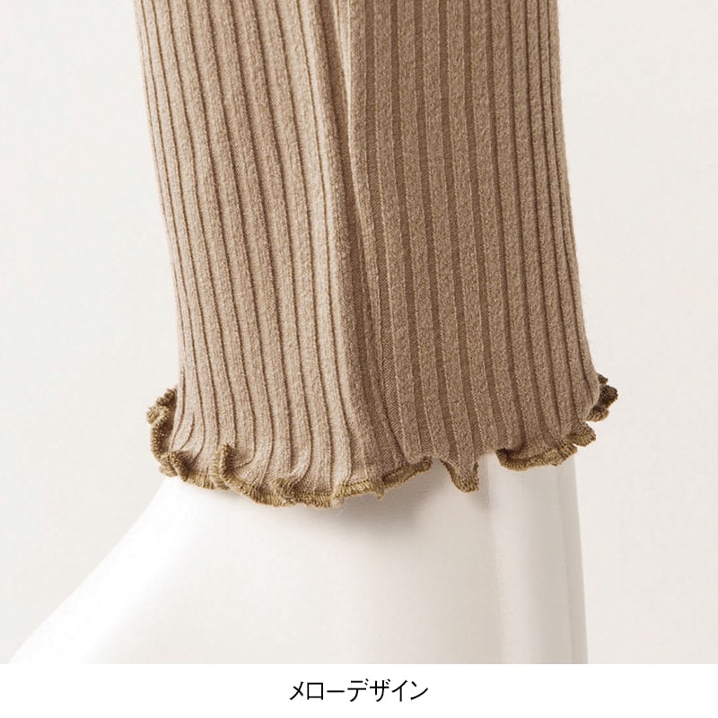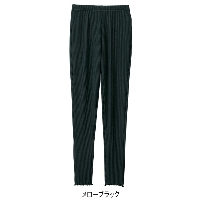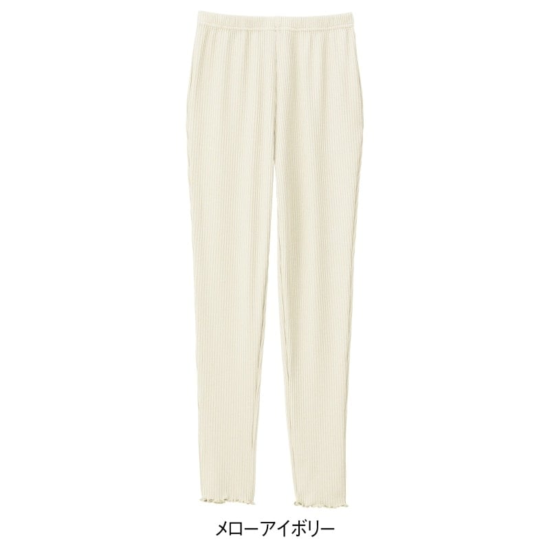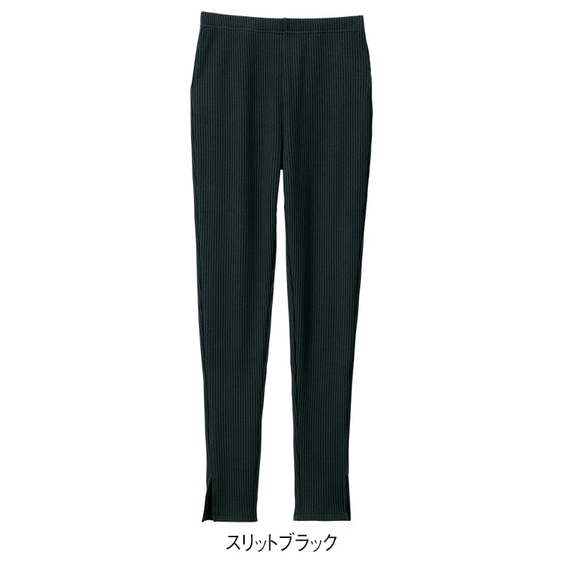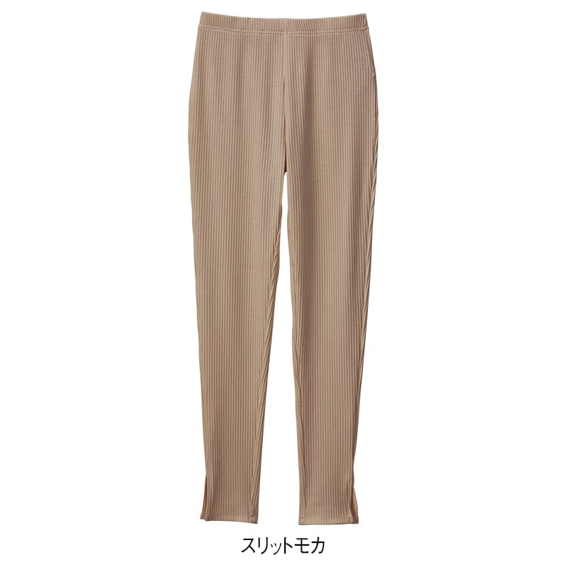 伸縮性のあるリブカットソー素材を使用したレギンス。裾は程よい開きのスリットと、フリルのようなメローステッチの2タイプ展開。