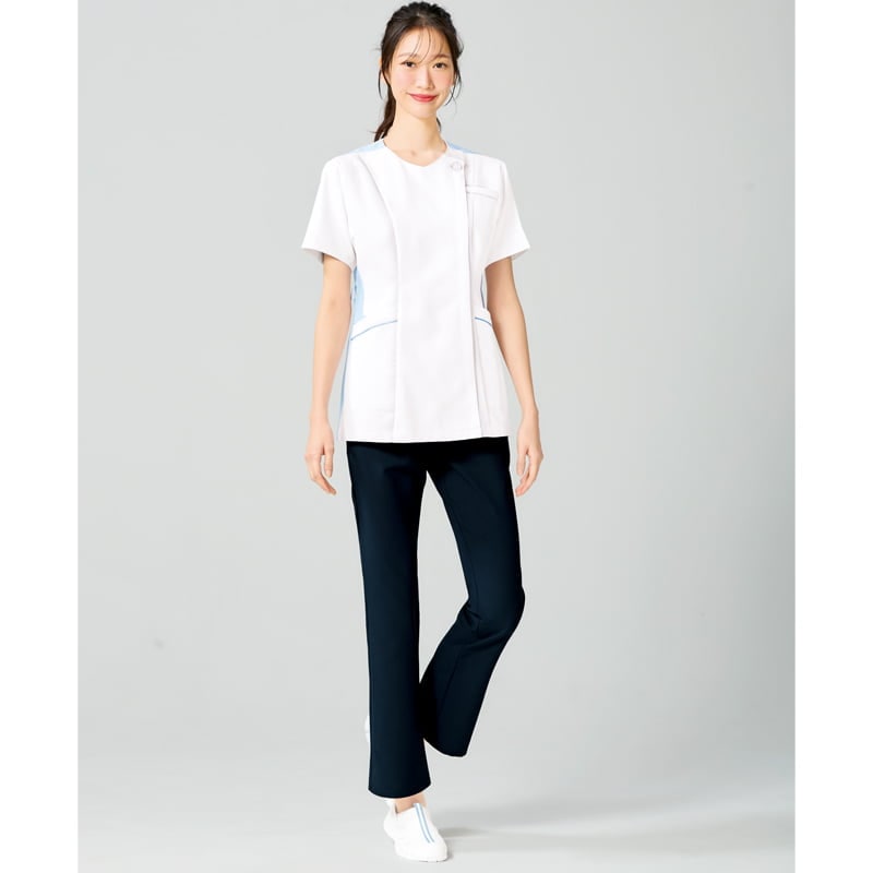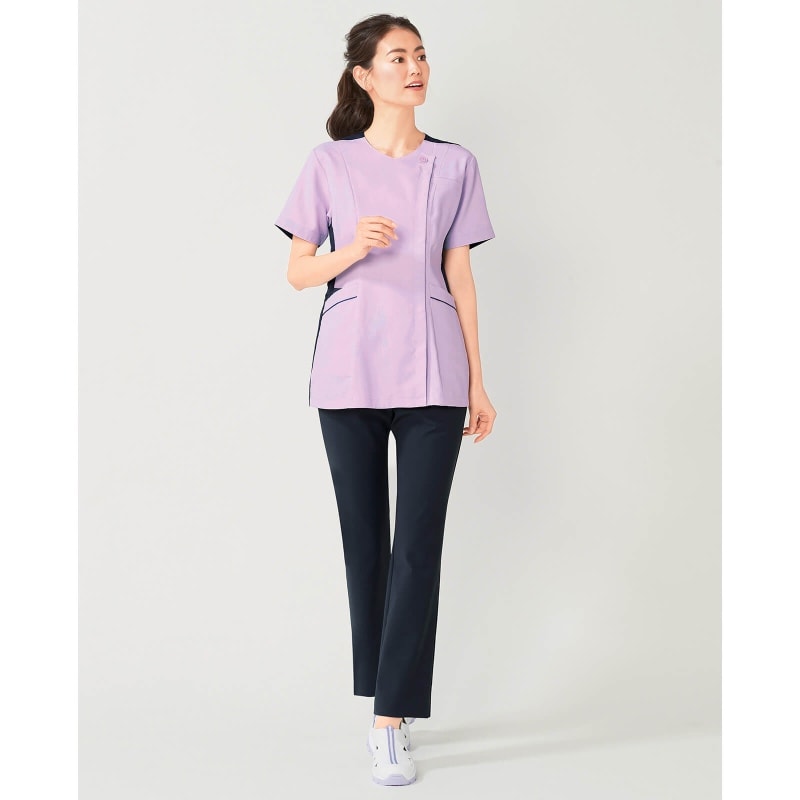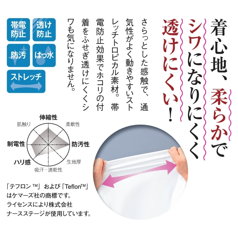 さらっとした感触で、通気性がよく動きやすいストレッチトロピカル素材。帯電防止効果でホコリの付着をふせぎ透けにくくシワも気になりません。