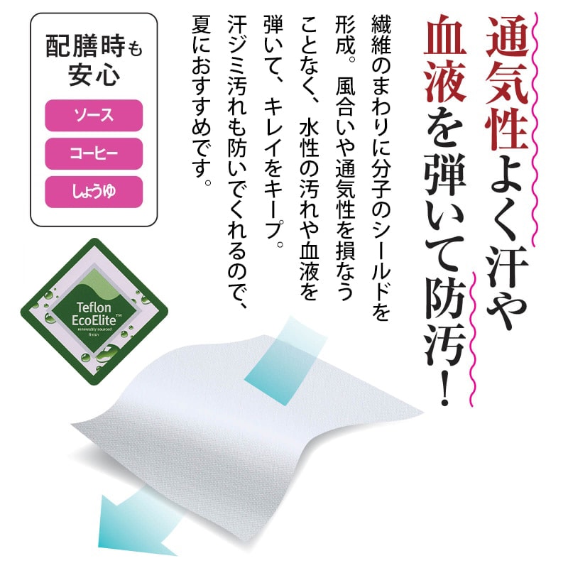 繊維のまわりに分子のシールドを形成。風合いや通気性を損なうことなく、水性の汚れや血液を弾いて、キレイをキープ。汗ジミ汚れも防いでくれます。