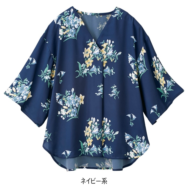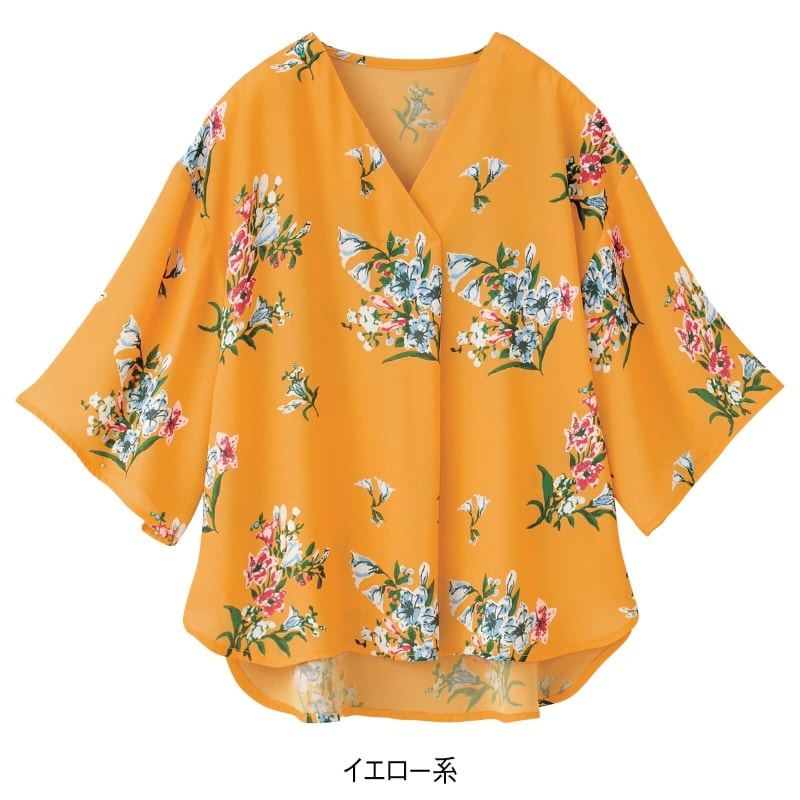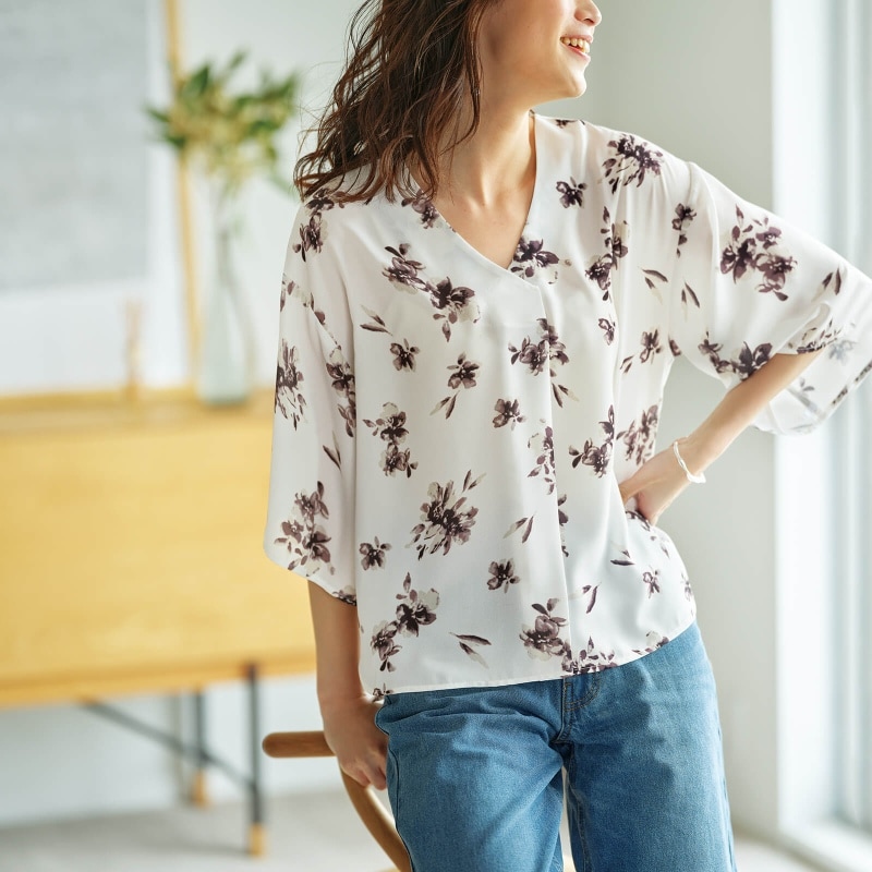 ボタニカルなフラワープリントのブラウス。