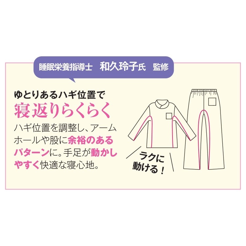 ハギ位置を調整し、アームホールや股に余裕のあるパターンに。手足が動かしやすく快適な寝心地。