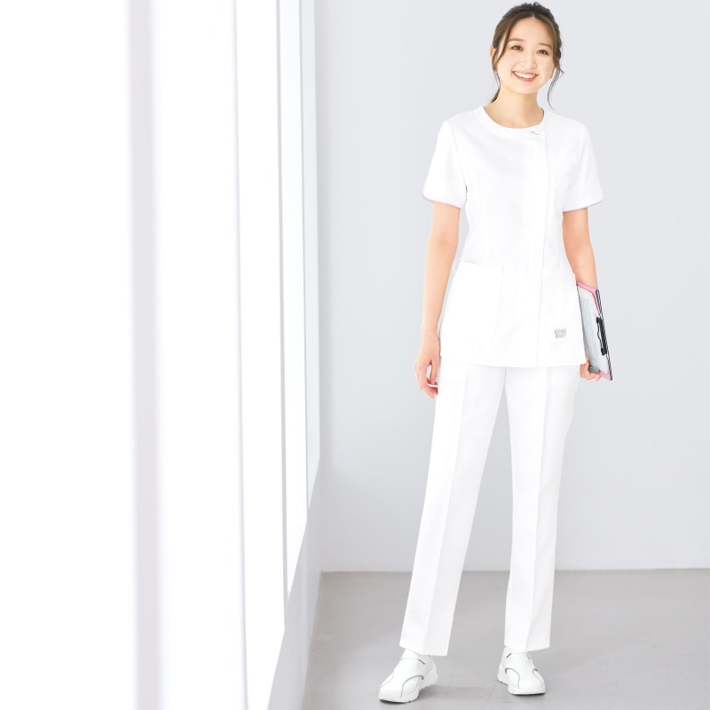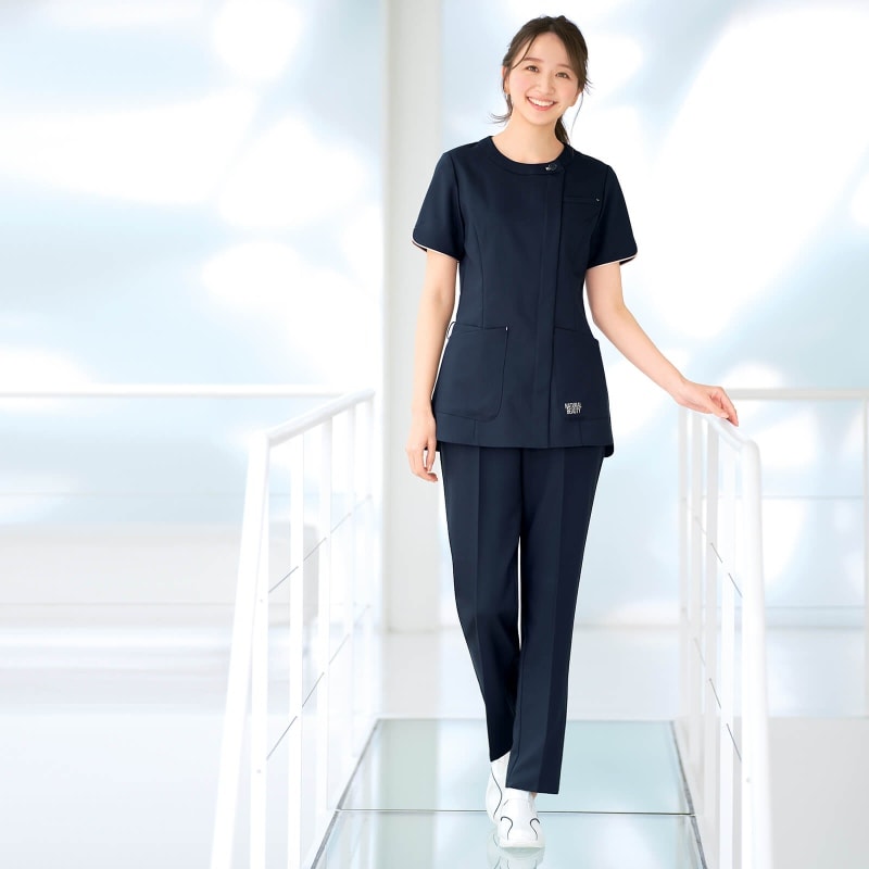 ポリエステル100%のタフな中肉厚素材で、シルエットが美しくでる適度なハリとコシを備えたストレッチ素材を採用。制電糸を入れているので、帯電防止にも優れています。