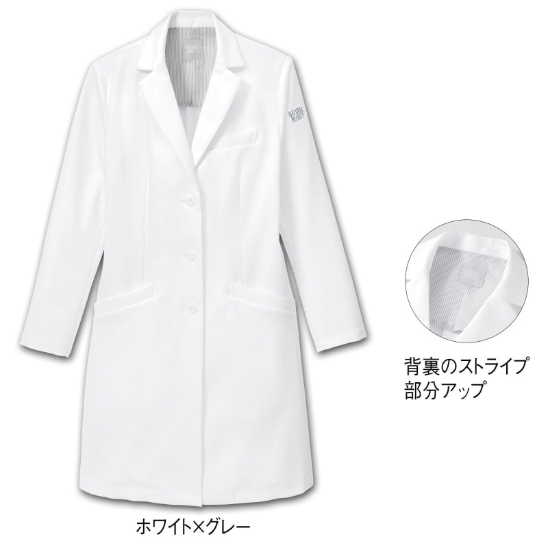 シルエットの美しさにこだわったドクターコート。背裏部分にのみ、ストライプ生地を配色使いし、ひとクラス上のおしゃれ感を表現しています。