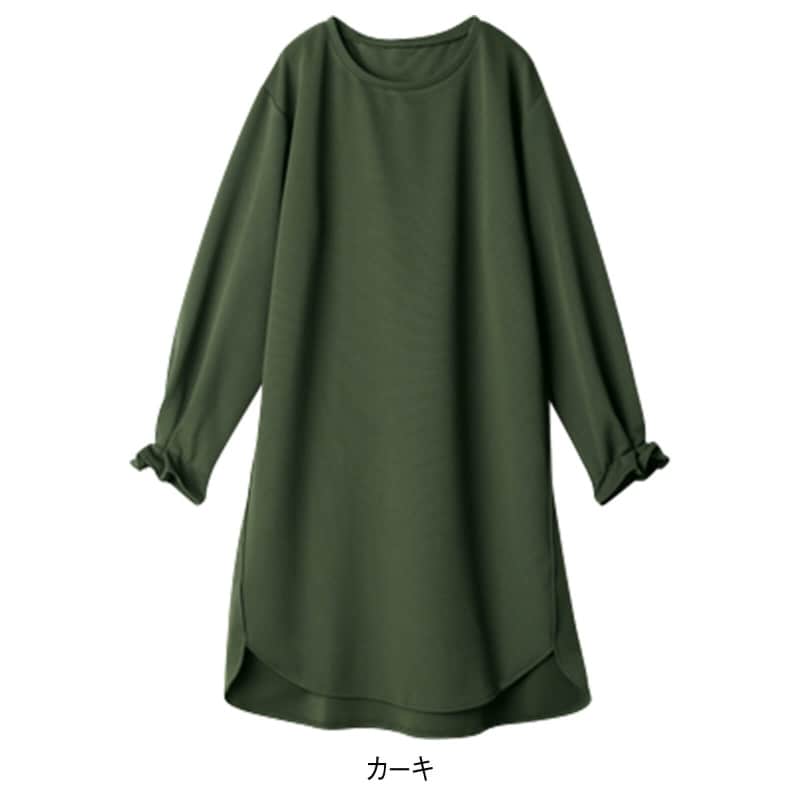 太ももをしっかり隠す長め丈とゆったりシルエットでスタイル美人見せに。