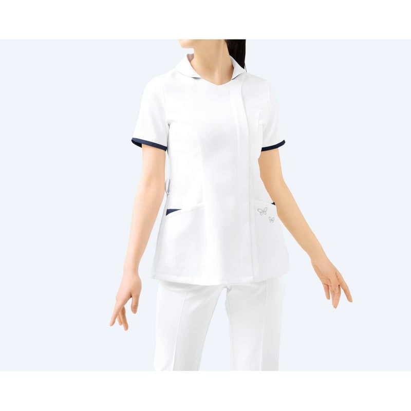 ハナエモリの白衣に使用している「ストレッチツイル」は国産生地で、その機能は優れた制電、防縮、制菌性を備えて肌あたりよく、シワにもなりにくく、さらに上質な風合いなので仕立て映えします。