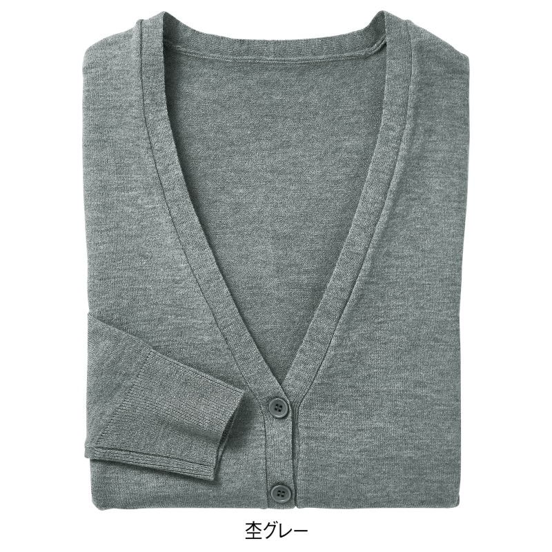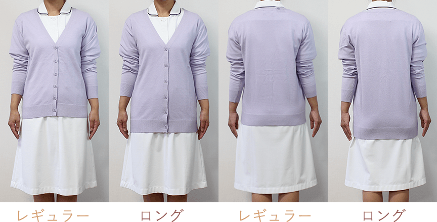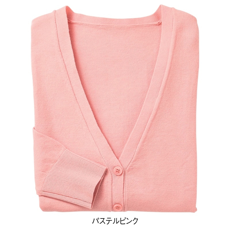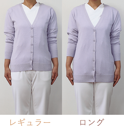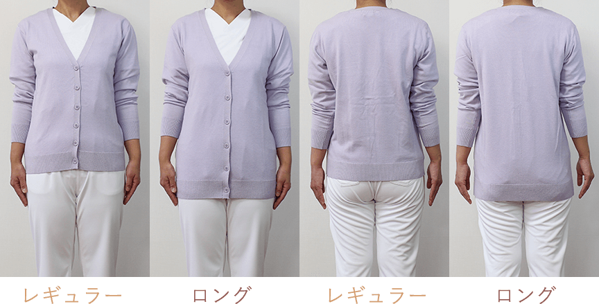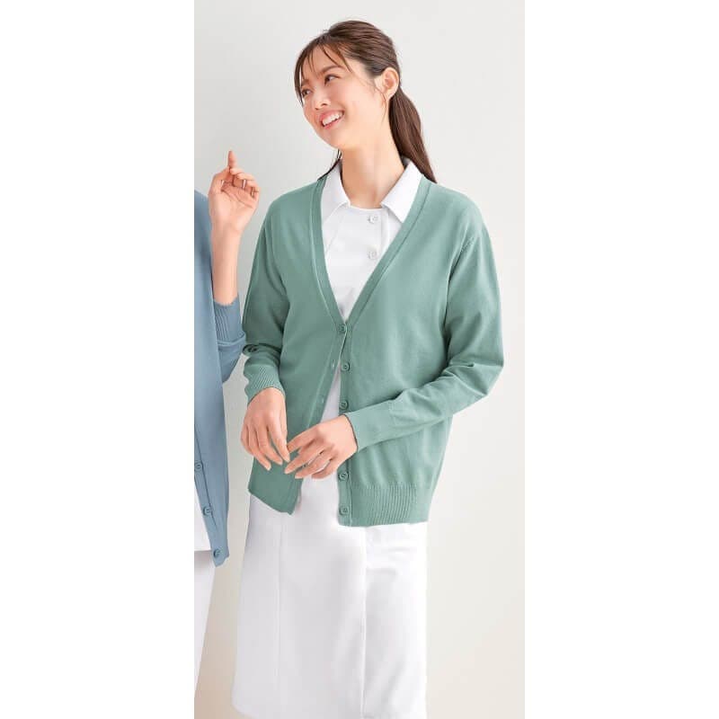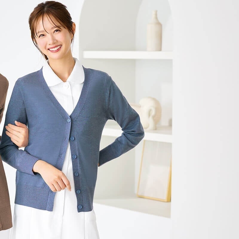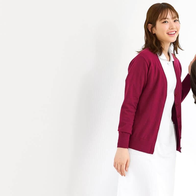 一般的なカーディガンより少しゆったりめ、ナース服のジャケット襟を出しやすいようにVネックは深め、また「袖をまくることが多い」ことを想定して、袖がずれにくいようにリブ幅が広めでフィットしやすいデザインです。