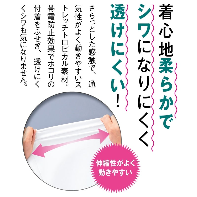 さらっとした感触で、通気性がよく動きやすいストレッチトロピカル素材。帯電防止効果でホコリの付着をふせぎ、透けにくくシワも気になりません。