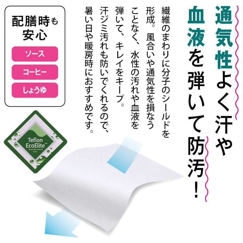 繊維のまわりに分子のシールドを形成。風合いや通気性を損なうことなく、水性の汚れや血液を弾いて、キレイをキープ。汗ジミ汚れも防いでくれるので、暑い日や暖房時におすすめです。