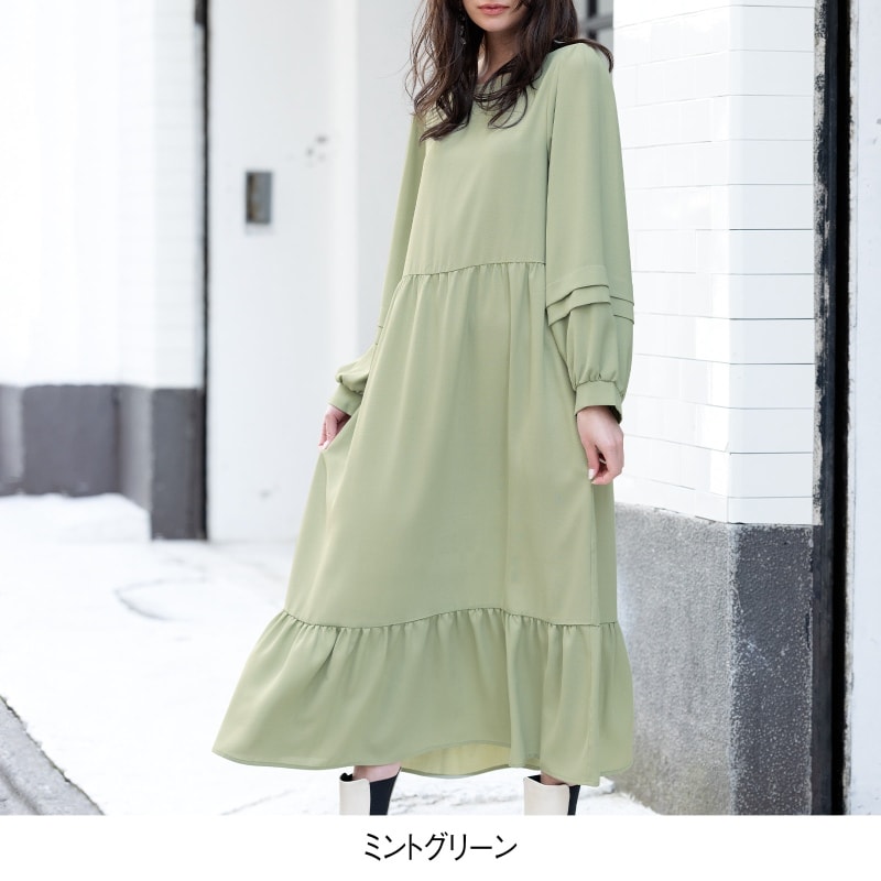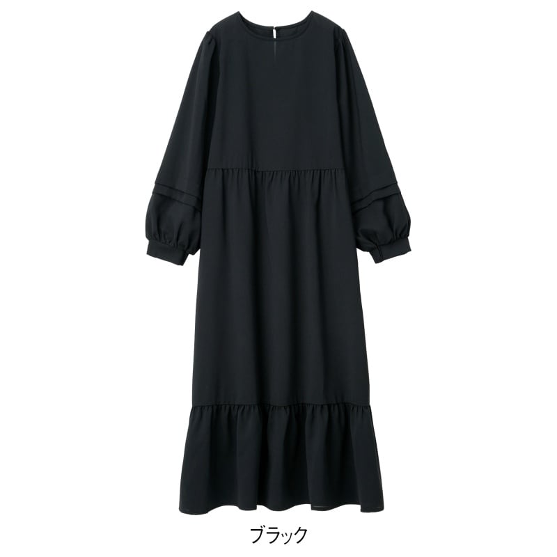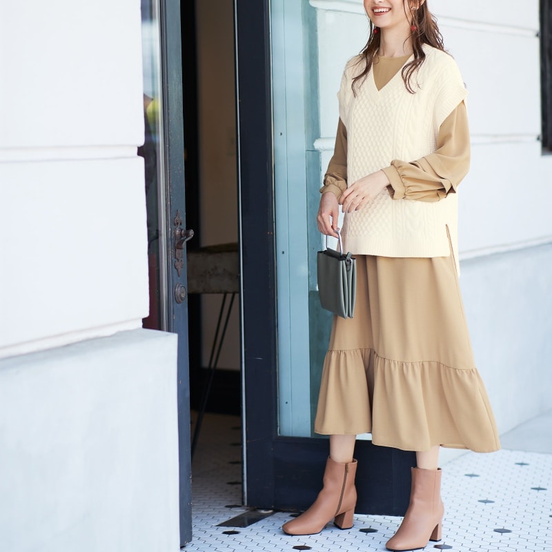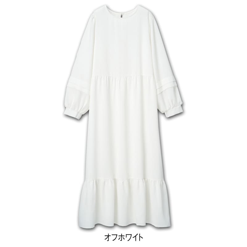 ウエスト部分のギャザーや裾の切替でほんのり甘いテイストに。