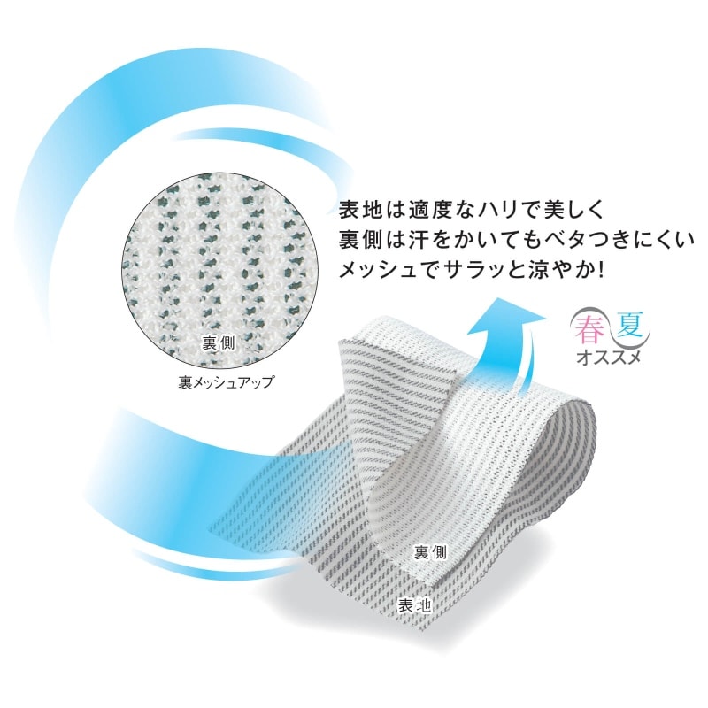 表地は適度なハリで美しく裏側は汗をかいてもベタつきにくいメッシュでサラッと涼やか!