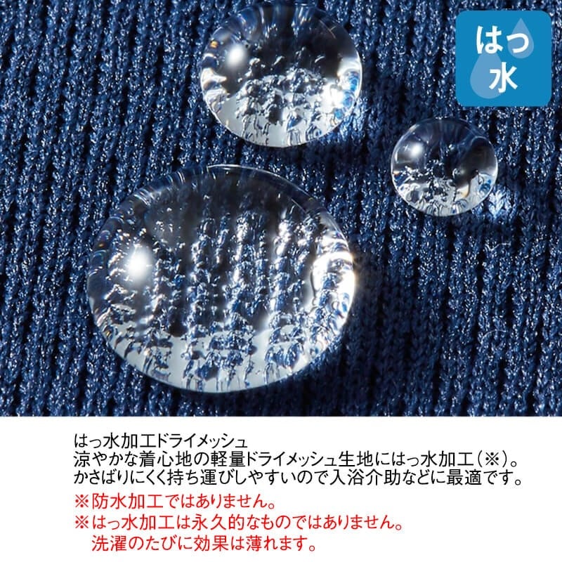涼やかな着心地の軽量ドライメッシュにはっ水加工。かさばりにくく持ち運びやすいので入浴介助などに最適です。