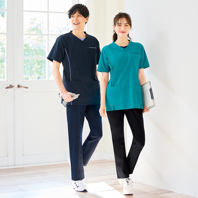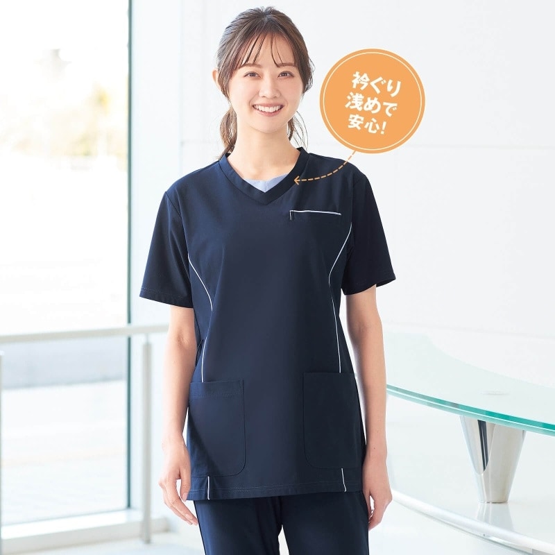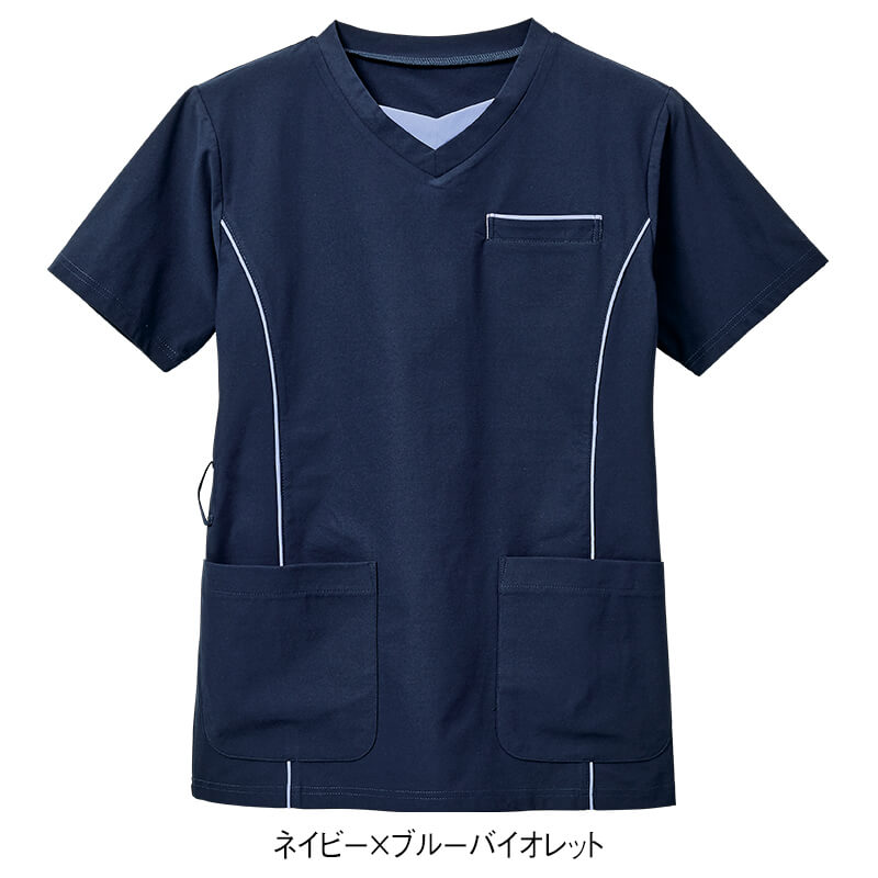 衿元&パイピングが素敵な薄軽ストレッチの動けるスクラブ