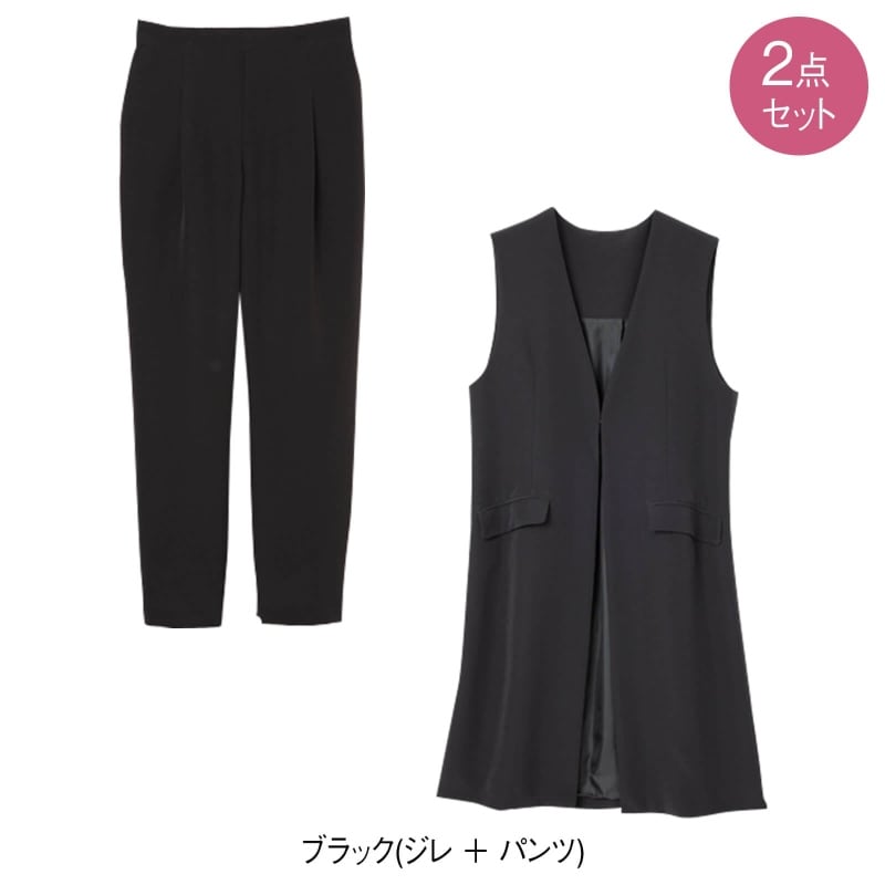 - ●素材/ポリエステル90%、ポリウレタン10% 〈ジレ〉フロントホック仕様、ポケット有、〈パンツ〉ウエスト後ゴム使い、ポケット有