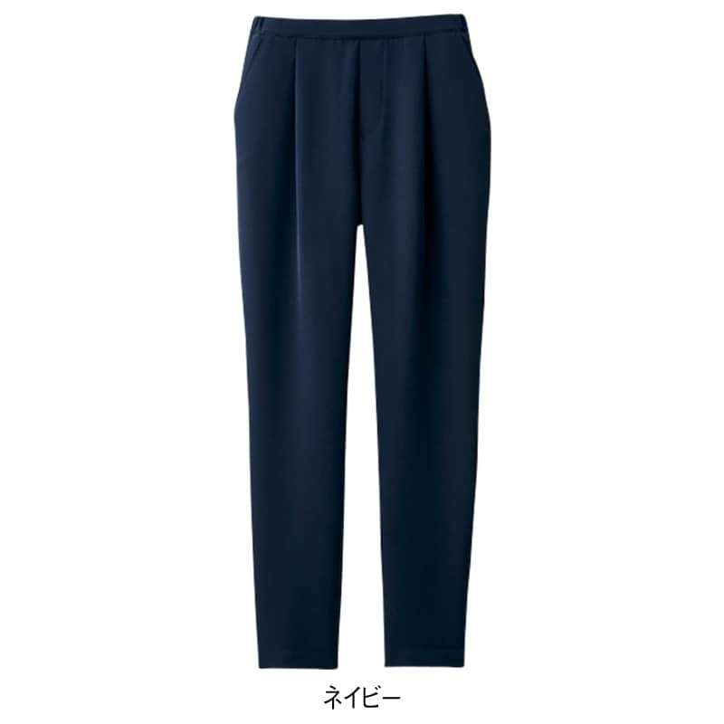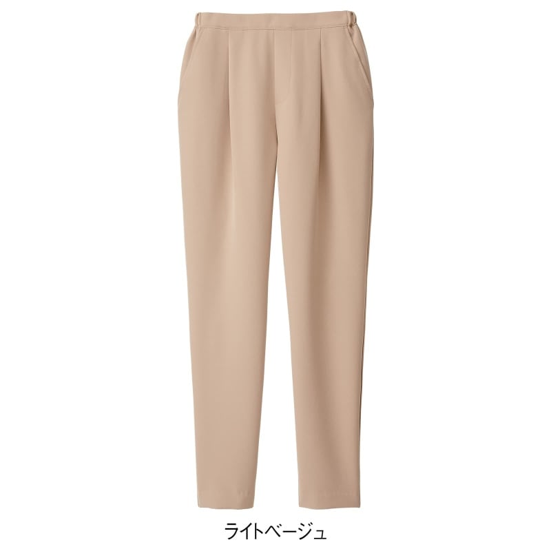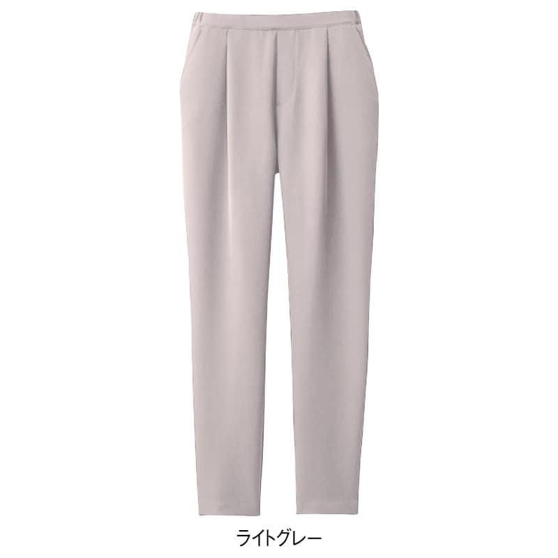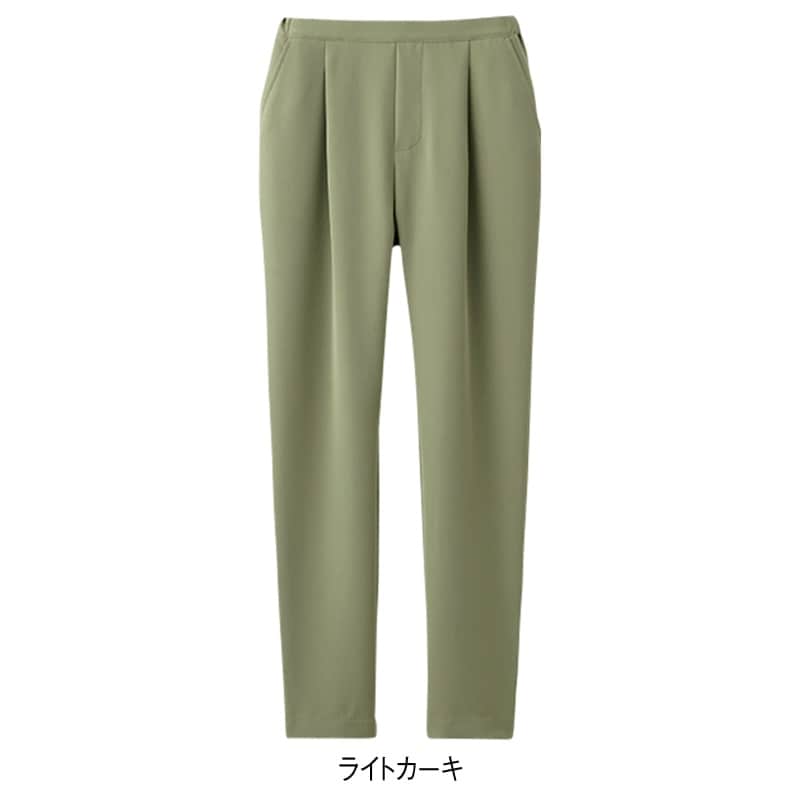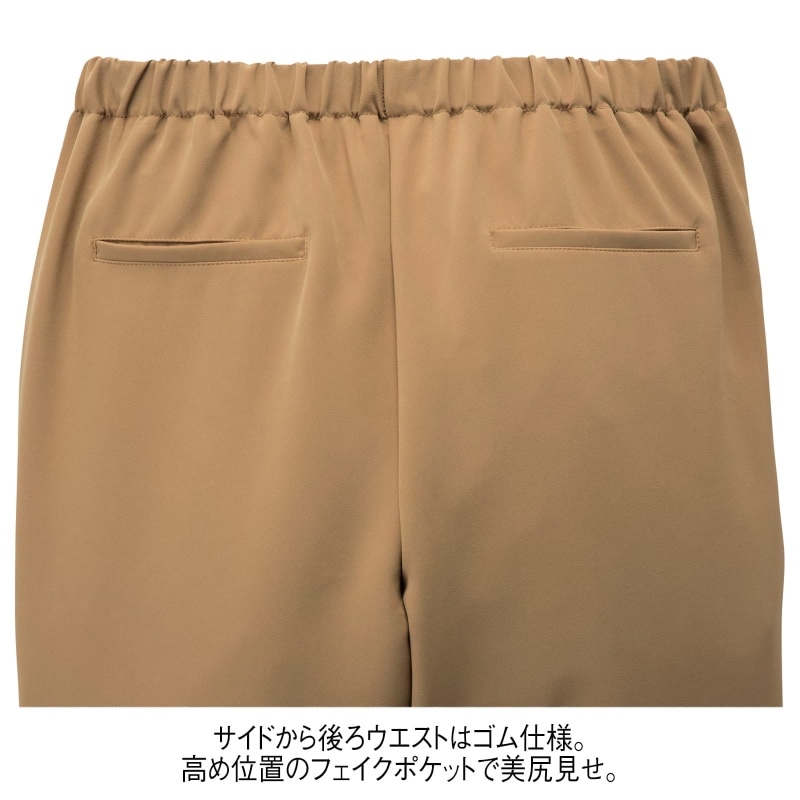 腰まわりはゆったり、裾に向かって細くなるテーパードパンツ。