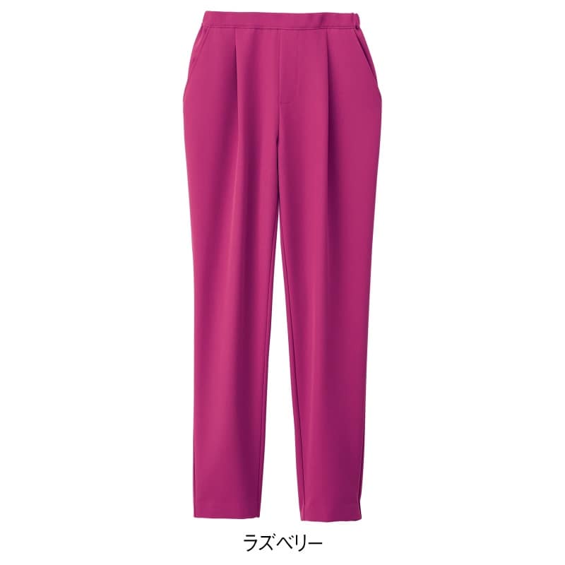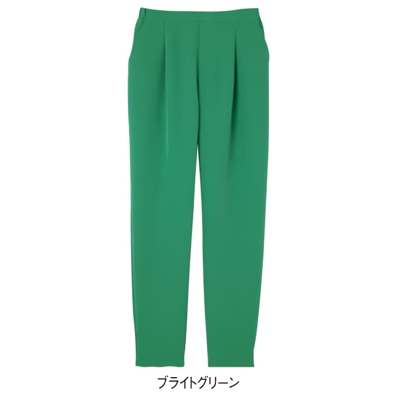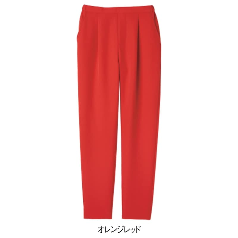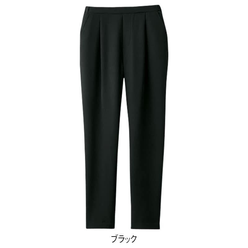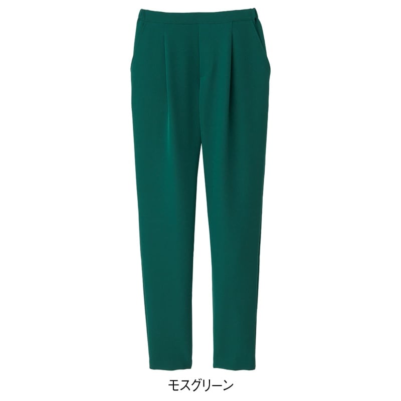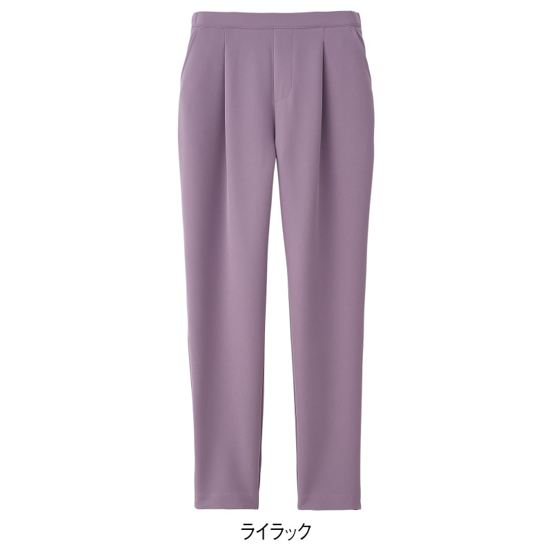 腰まわりはゆったり、裾に向かって細くなるテーパードパンツ。