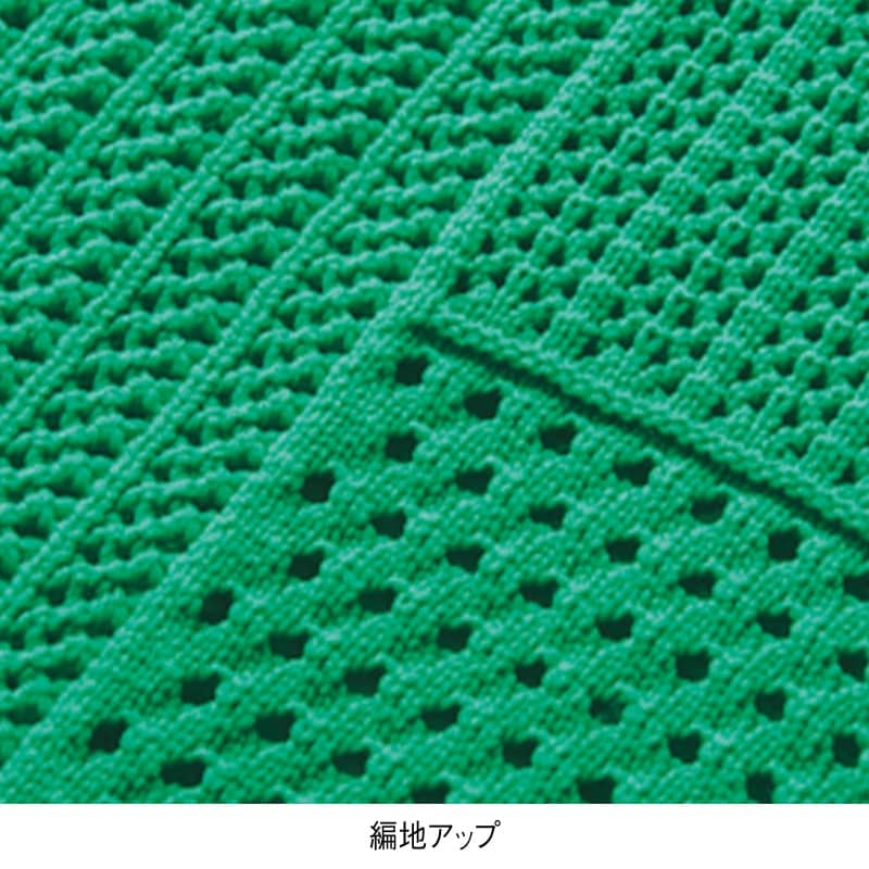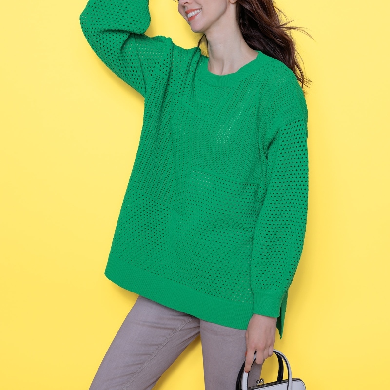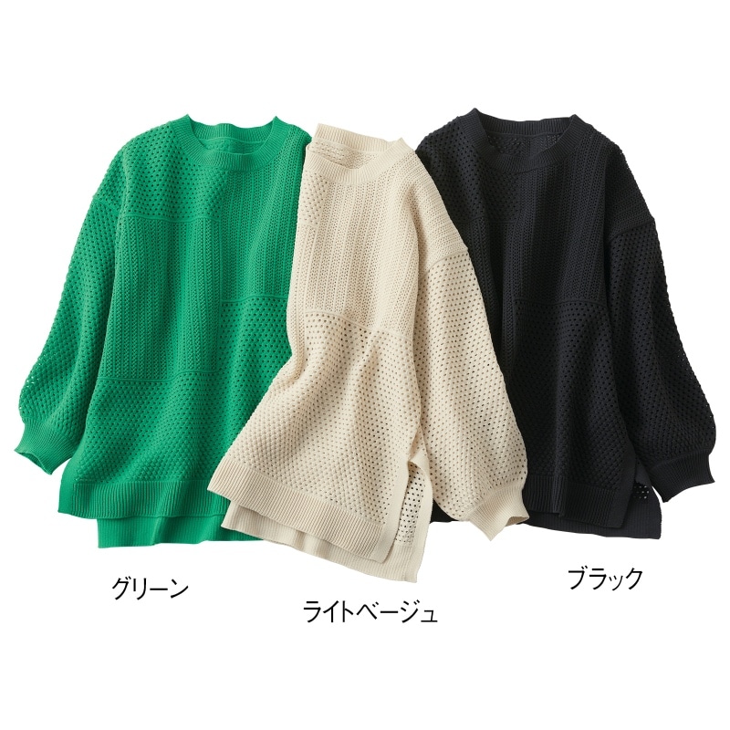 パターンの異なるメッシュ編み地をブロッキングで切り替えたひとくせデザインで、ワン・ツーコーデも新鮮に。