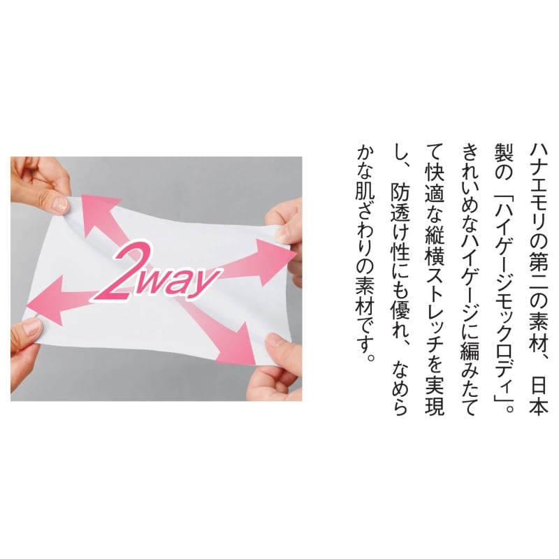 ハナエモリの第二の素材、日本製の「ハイゲージモックロディ」。きれいめなハイゲージに編みたてて快適な縦横ストレッチを実現し、防透け性にも優れ、なめらかな肌ざわりの素材です。