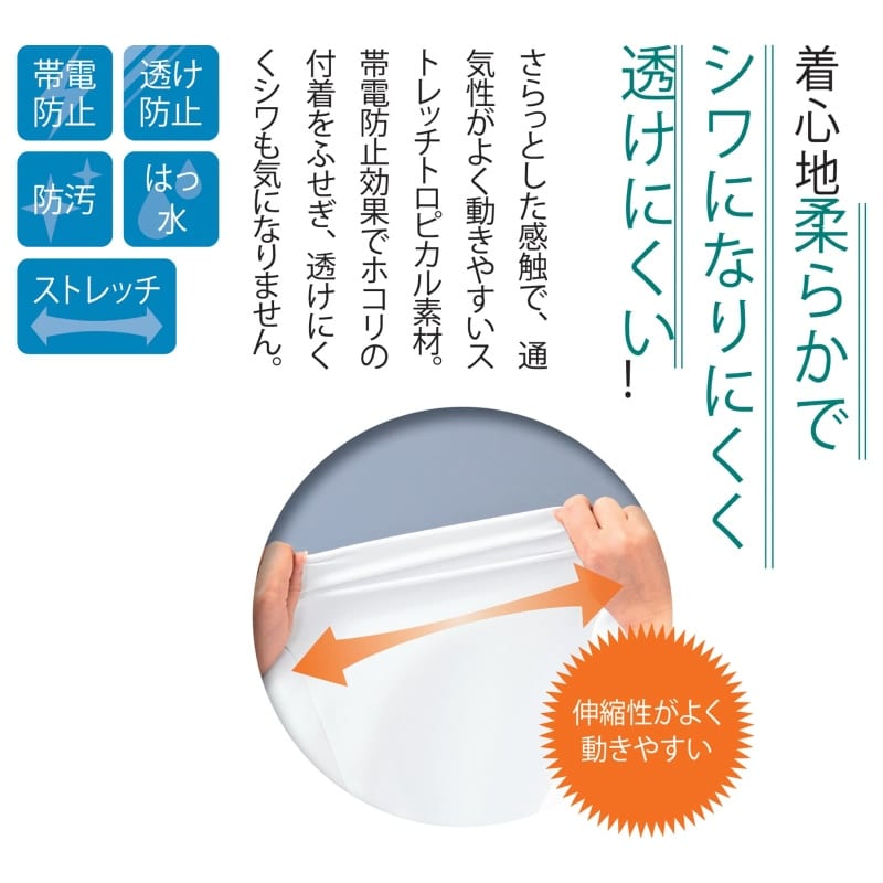 帯電防止効果でホコリの付着をふせぎ、透けにくくシワも気になりません。