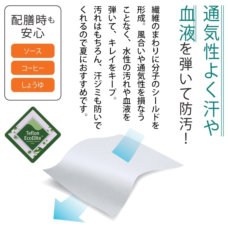 繊維のまわりに分子のシールドを形成し、風合いや通気性を損なうことなく水性の汚れや血液を弾いて、キレイをキープ。
