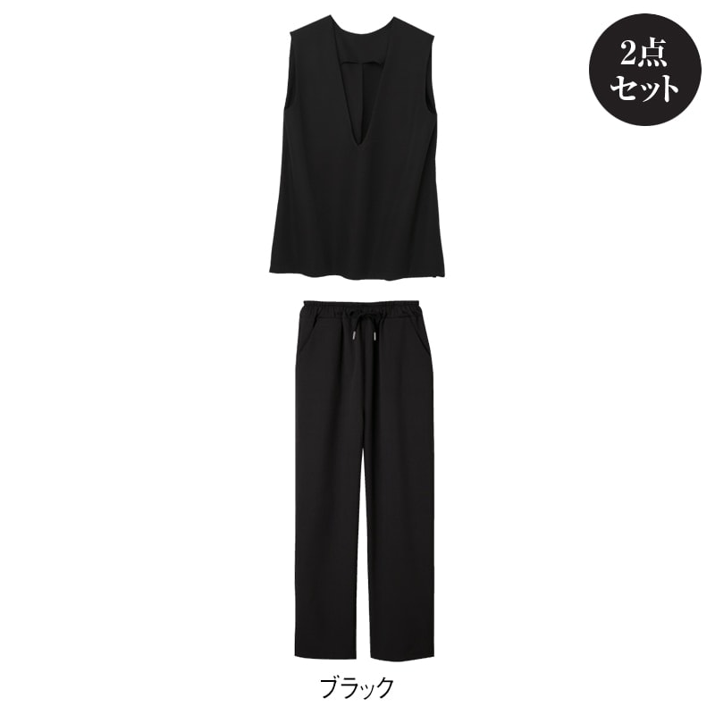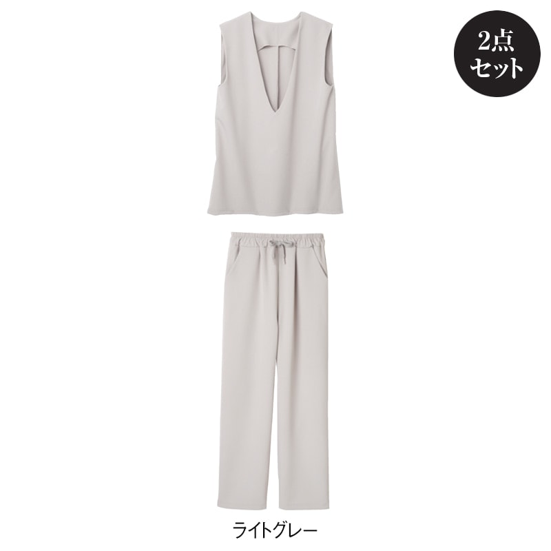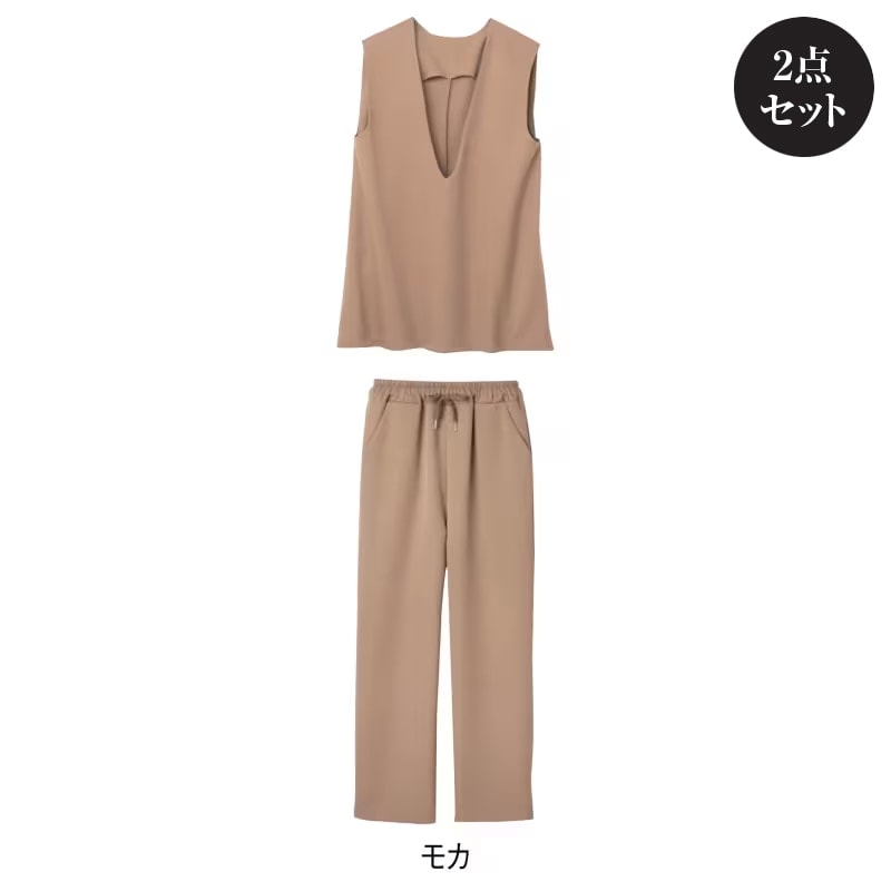 深Vのベスト風トップスとハンサムなパンツ、コーデいらずの上下がセットアップとして登場。