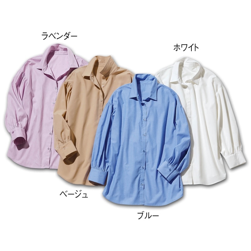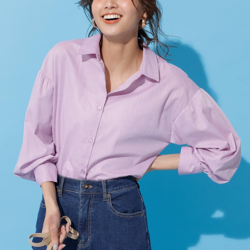 ドロップショルダーや袖山やカフスに寄せたさりげないギャザーが、控えめなフェミニン感をプラス。