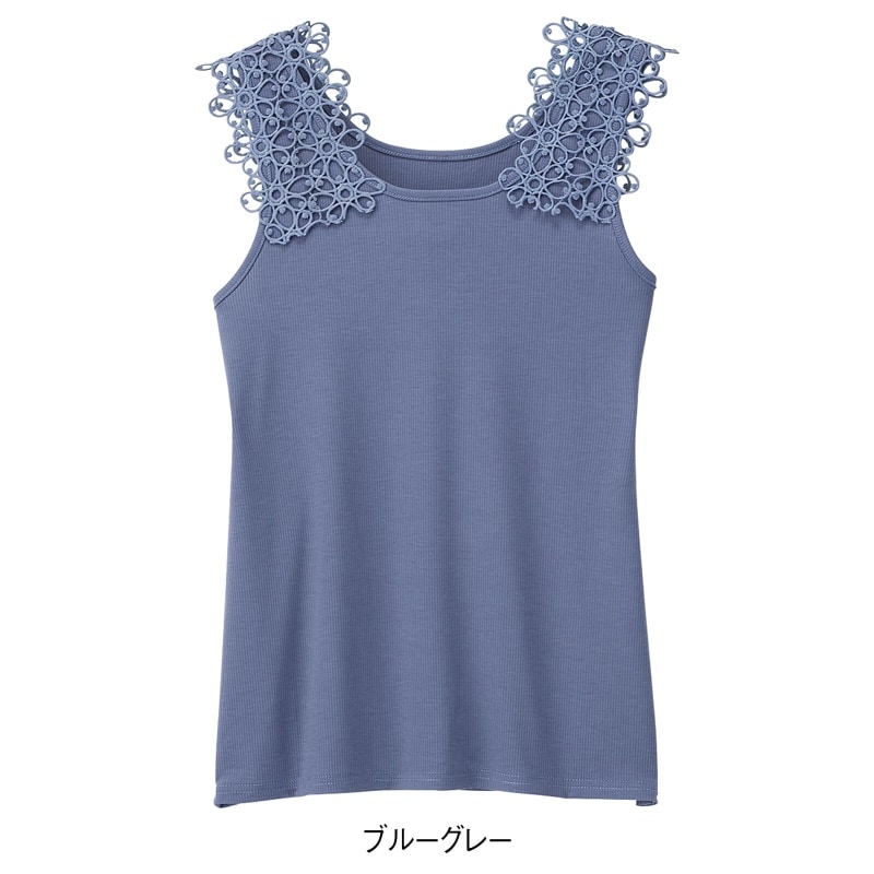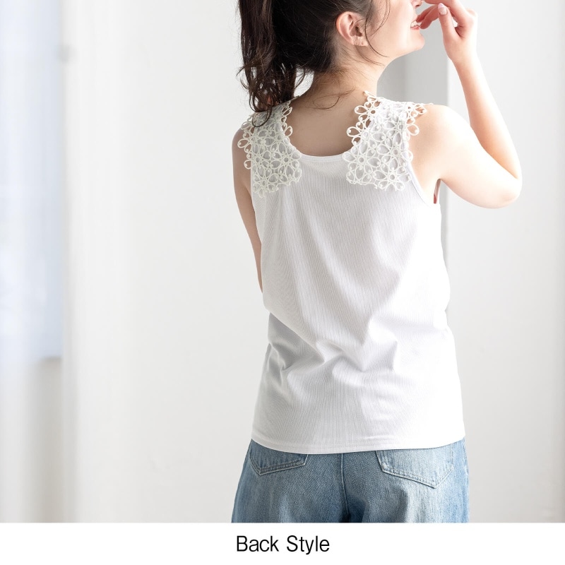 肩部分にレースを贅沢にアレンジし、首元からちら見せすれば華やかなコーデが完成。