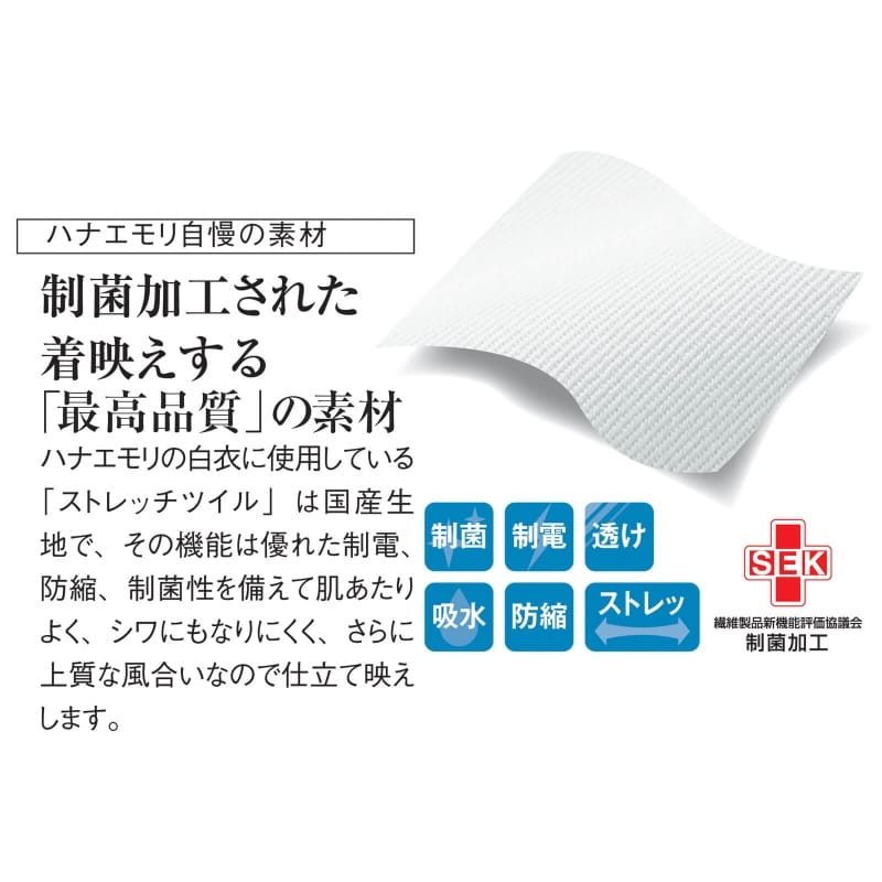 ハナエモリの白衣に使用している「ストレッチツイル」は国産生地で、その機能は優れた制電、防縮、制菌性を備えて肌あたりよく、シワにもなりにくく、さらに上質な風合いなので仕立て映えします。