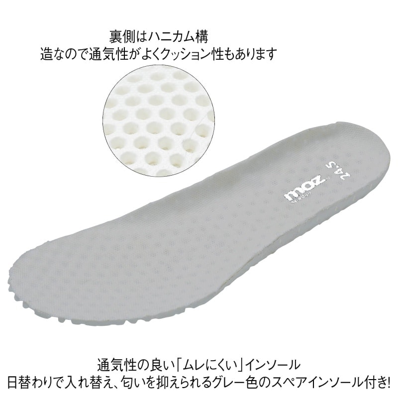 ・通気性の良い「ムレにくい」インソール:日替わりで入れ替え、匂いを抑えられるグレー色のスペアインソール付き!裏側はハニカム構造なので通気性がよくクッション性もあります