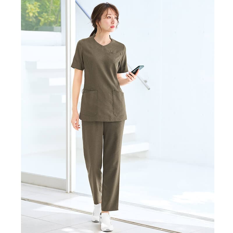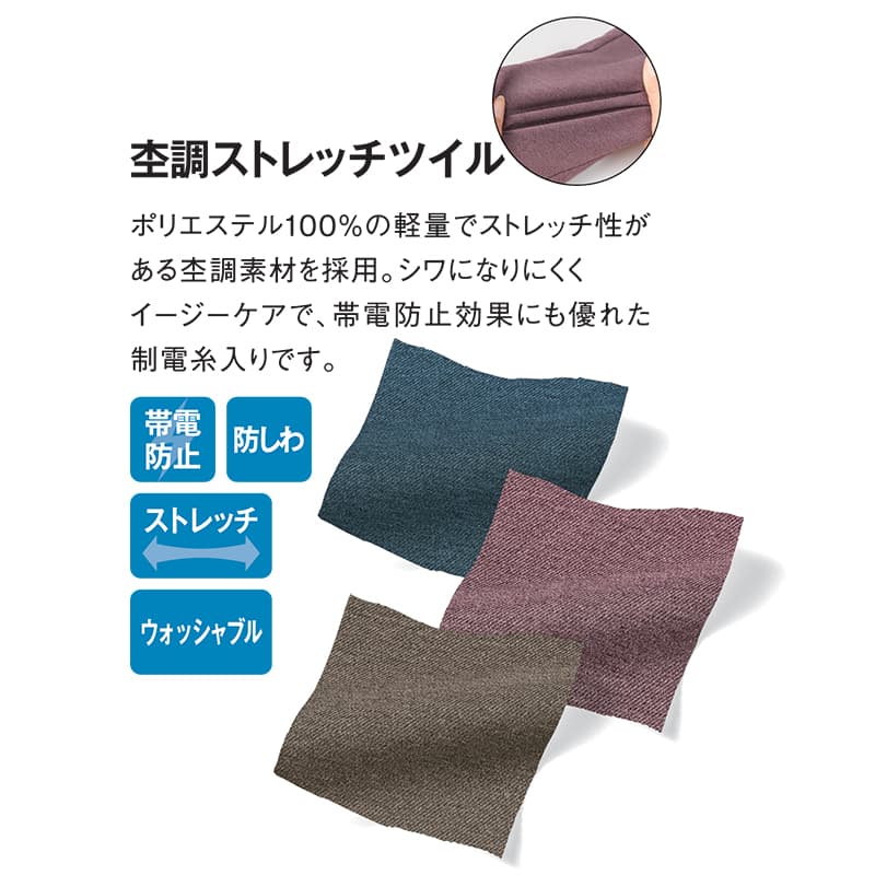 ポリエステル100%の軽量でストレッチ性がある杢調素材を採用。シワになりにくくイージーケアで、帯電防止効果にも優れた制電糸入りです。